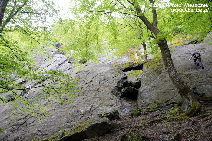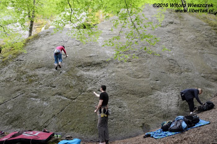 Postanawiamy wrócić na znaną nam już stronę skały i na deser powtórzyć sobie tamtejsze drogi. Jakoś gorzej to wszystko nam idzie. Jestem pod ogromnym wrażeniem swojej odwagi, że w to nieszczęsne V+ w ogóle się wstawiałem! Poza jedną parą, wszyscy Czesi wspinali się tutaj na wędkę... Kurcze, chyba musiałem być pijany!