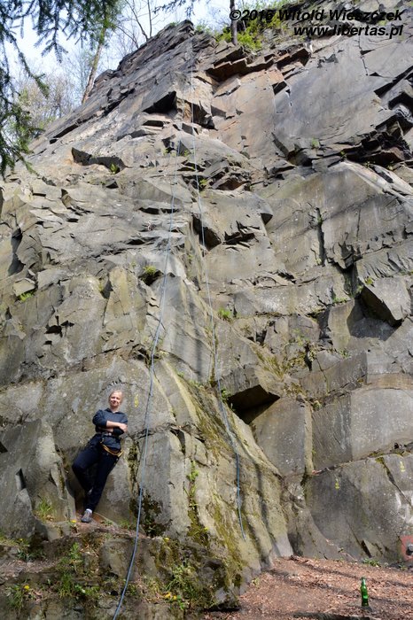 Czeskie obicie jest nieco bardziej przygodowe niż polskie, ale ponoć, jeśli nie potrafisz za coś umrzeć, to nie powinieneś tego robić. Otwieram więc piwo i pociągam solidny łyk odwagi i talentu! Pij Kasiu, pij, bo zaraz i ty prowadzisz! Rzut okiem na przewodnik. Na zapoznanie się ze skałą wybieram trójeczkę i bez żadnego problemu dochodzę na górę, ze zdziwieniem stwierdzając, że obicie jest lepsze niż potrzeba! Nie no, nie będziemy wędkować. Będziemy robić drogi po kolei, omijając najwyżej te powyżej naszych możliwości. Następna jest szóstka. Kasia się wstawia, ale po pierwszej wpince coś marudzi. Podnoszę wzrok i dopinguję. Niestety! Kasia popełnia błąd strategiczny i wcześniej pociąga tylko jeden łyk piwa! To za mało.
