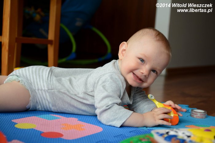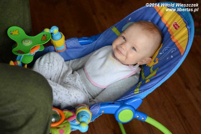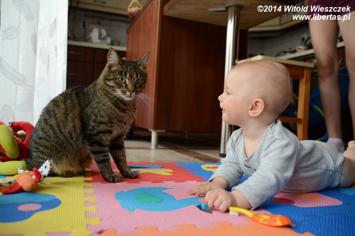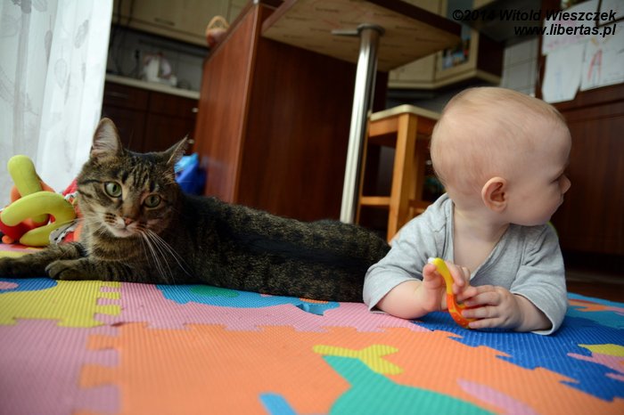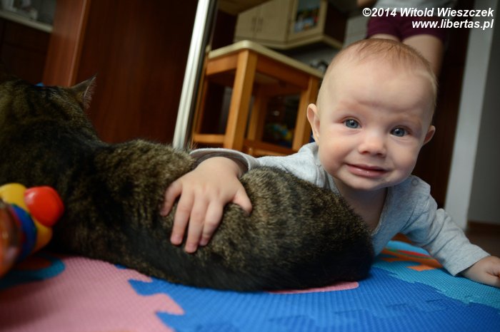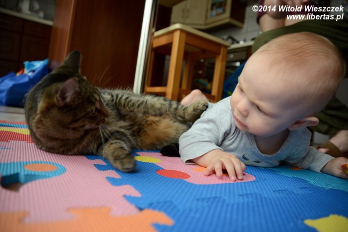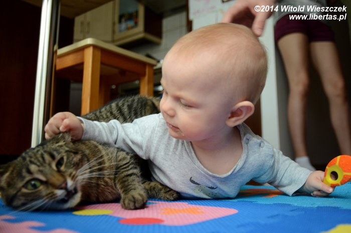 Tymczasem Dobrawa bawiła się z Tesą. Tesa ma w sobie coś z masochistki, bo uwielbia być przez naszą najmłodszą pociechę tarmoszona. Przychodzi, nadstawia się i dzielnie znosi wszelkie szarpanie. W dodatku ma jakiś dziwny instynkt, który zabrania jej odpowiadać Dobrawie tym samym. Mnie przy takich zabawach potrafi podrapać, a kostki Mai nieraz już były obiektem jej polowań. Dobrawa natomiast może ją tarmosić całkiem bezkarnie. Raz chyba tylko Tesa ją delikatnie drapnęła, ale może to też był wypadek?