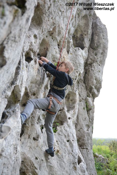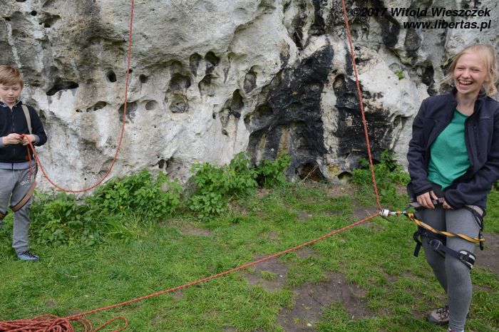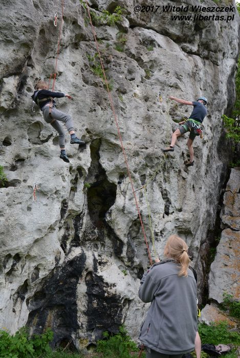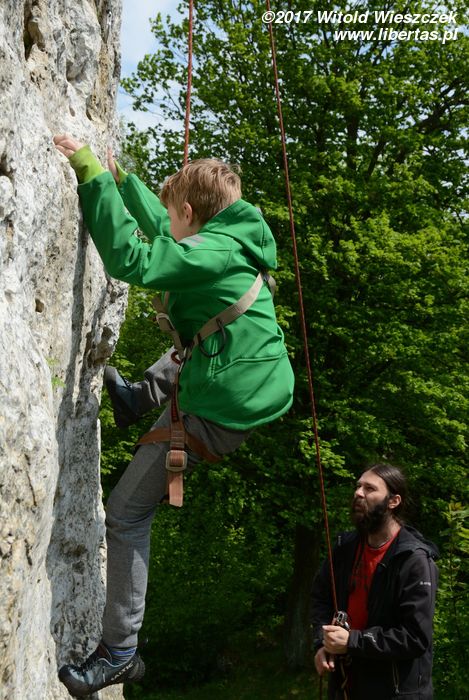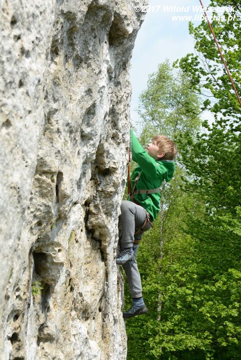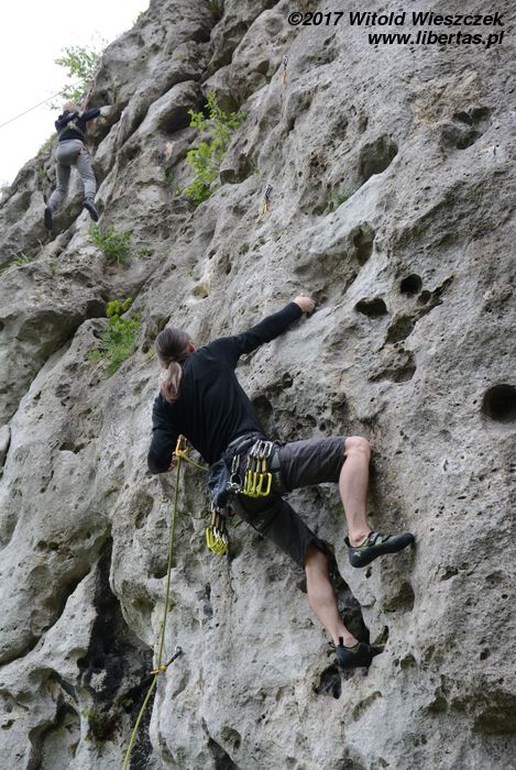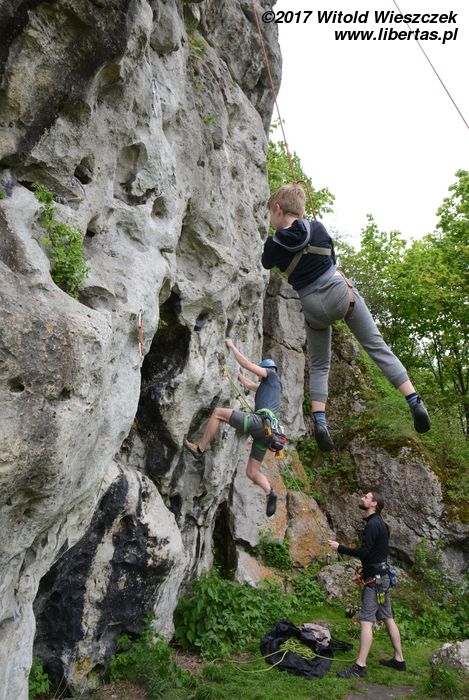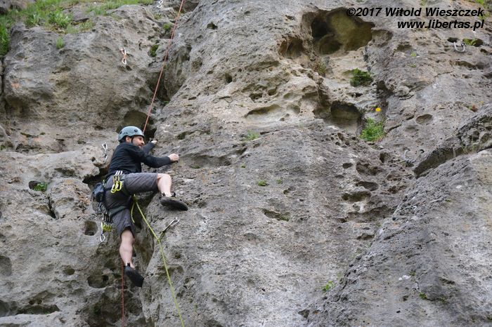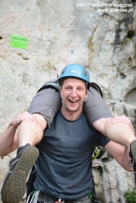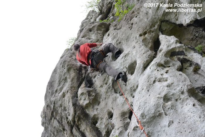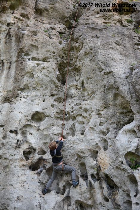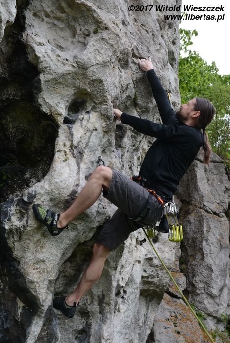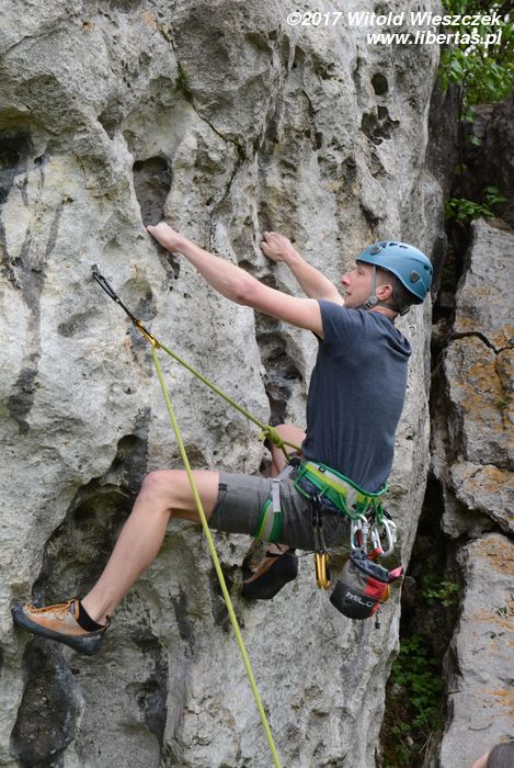 Jeremi twierdzi, że nazwa tego miejsca pochodzi od utopców, które właśnie tutaj lubiły się topić ze strachu przed wiedźminami. Było to oczywiście w czasach, gdy widoczne na zdjęciach skały przykrywała jeszcze głęboka woda, ale nazwa przetrwała. W każdym razie na tutejszym poligonie wspinaczkowym testujemy i promujemy super nowoczesny kask firmy Pelc. Uwaga, pora na krypto reklamę.