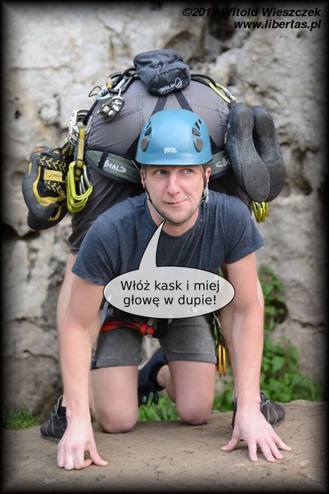 Piotrek dostał na zajączka stary kask po dziadku, a żeby mu nie było głupio, że poza nim nikt się w kasku nie wspina, zaczął go nam pożyczać i promować bardzo interesującym skrótem myślowym. Slogan tak się spodobał szychom z Pelca, że zasponsorowali nam kilka skrzynek piwa. Kto wie, może w przyszłym sezonie dostaniemy od nich po kasku na głowę, ale póki co mamy jeden na cały klub, więc nadal w większości jesteśmy... stuknięci. Nie od razu Rzym czy inny Kraków zbudowano. Na drugim komiksie omawiamy bezpieczeństwo z perspektywy pozostających w domu partnerek umiejących już wiązać ósemki nie tylko na linie. Uwaga! Nie róbcie tego w domu!