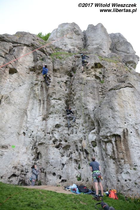 Rozgrzewamy się na Pasiece, a potem przenosimy na Zamkową, gdzie dołączają do nas Piotrek i Alu. Wraz z chłopakami od jakiegoś czasu promujemy bezpieczne wspinanie. Poradnik przyjął formę komiksu, w myśl intuicji, że większość ludzi to jednak analfabeci i trzeba do nich mówić prostym językiem. Poza tym, bądźmy szczerzy, na bezpieczeństwie to my się wcale nie znamy, więc na wszelki wypadek udajemy, że przynajmniej jesteśmy zabawni.