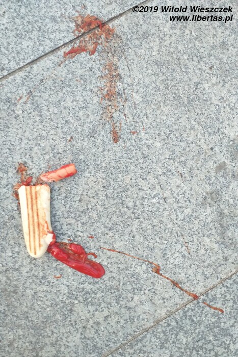 Tyle historii, a co się stało w Elblągu 13 sierpnia 2019 roku? Otóż Kasia przejechała gorącego psa, a właściwie to przejechała się na gorącym psie. W Elblągu nie pieniądze, ale jedzenie dosłownie leży na ulicy. A konkretnie leżał sobie gorący pies, którego Kasia wznosząca wzrok wysoko na szczyty pięknie odbudowanych kamieniczek po prostu nie zauważyła. Przejechała po nim swoim sandałem, aż z tego bogu ducha winnego stworzenia trysnęła czerwona keczupem krew. Horror, jak mawiają Anglicy.