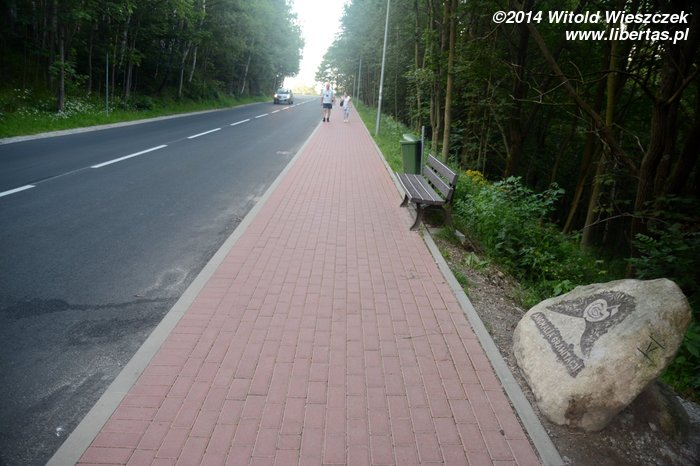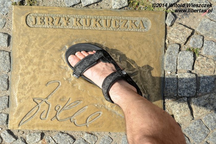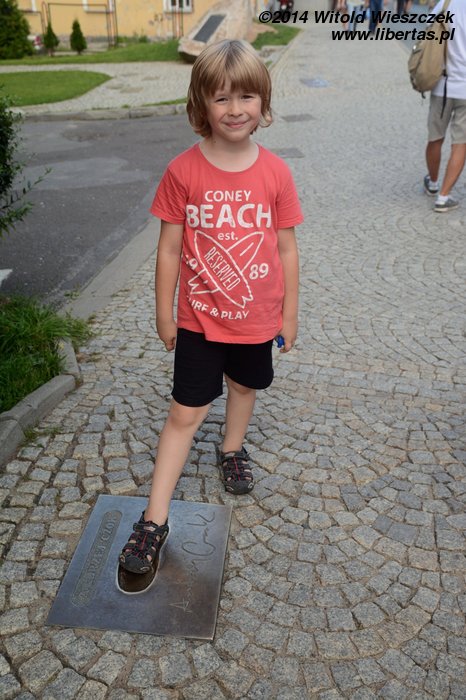 Ze Śliwic wyjechaliśmy po śniadaniu i dość sprawnie dotarliśmy do Karpacza, gdzie natychmiast przystąpiliśmy do poszukiwania noclegów. Oczekiwania cenowe miejscowych hotelarzy wydały mi się bardzo wygórowane, więc trochę to zajęło, ale ostatecznie znalazłem nocleg w jakiejś rozsądnej cenie. Godzina jeszcze młoda, resztę dnia możemy wykorzystać na zwiedzanie miasteczka. Zaczynamy od głównego deptaku i Skweru Śladów Zdobywców, gdzie zobaczyć można odbite w brązie ślady butów wielu wybitnych polskich himalaistów. Zresztą nie tylko zobaczyć, ale i przymierzyć! Jeremi się mierzył z Andrzejem Czokiem, który w 1985 roku razem z Jerzym Kukuczką dokonał pierwszego zimowego wejścia na Dhaulagiri.
