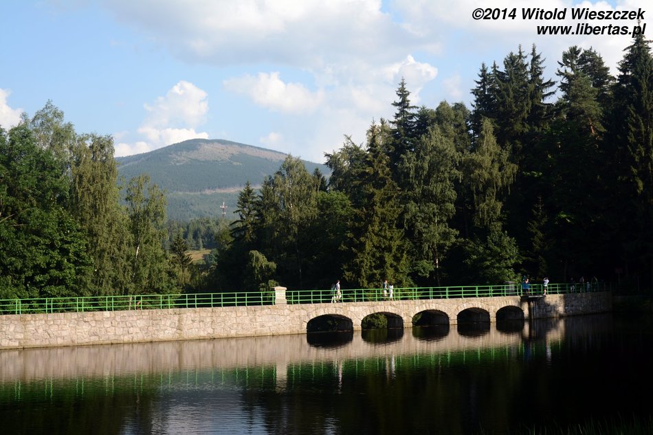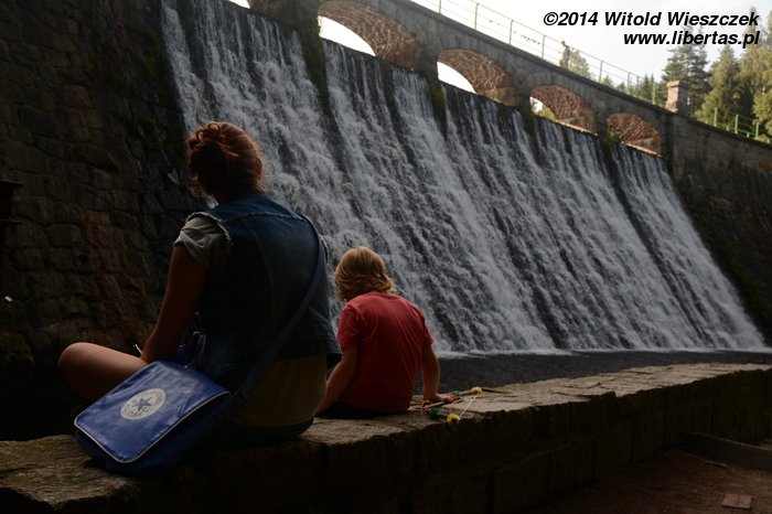 Później spacerkiem przeszliśmy do Zapory na Łomnicy, która tworzy malownicze rozlewisko. Zbudowana z granitowych bloków zapora ma 105 metrów długości i można po niej przejść na drugą stronę rzeki. Obchodzimy zalew, przechodzimy kolejnym mostkiem po drugiej stronie i wchodzimy na bardzo przyjemną alejkę prowadzącą w górę rzeki. Idziemy dalej, pchając mozolnie pod górę wózek z Dobrawą.
