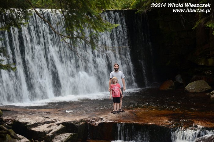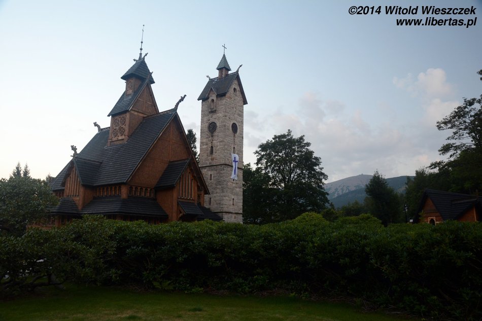 Jeremiego bolą już nogi, ale przecież jutro mamy iść w góry, więc zaprawa mu się przyda. Nie ma, że boli! Zresztą Dziki Wodospad bardzo mu się podoba i szybko o bólu nóg zapomina, zwłaszcza, że wracając, przez jakiś czas idziemy w dół. Ale to jeszcze nie koniec. Karpacz leży na wysokości 480–885 m n.p.m., więc małe nóżki mogą się zmęczyć takimi spacerami w górę i w dół. Niech się męczą! Dopinguję Jeremiego, że dzięki temu będą potem silniejsze. Działa. Odbijamy do Karpacza Górnego, więc znowu pchamy nasz majdan do góry, tym razem do Świątyni Wang. Ten piękny drewniany kościółek został zbudowany na przełomie XII i XIII wieku w norweskiej miejscowości Vang. W XIX wieku dla berlińskiego muzeum kupił go król Fryderyk Wilhelm IV, ale ostatecznie zabytek trafił do Karpacza, gdzie został odbudowany. Piękny. Dobranoc.