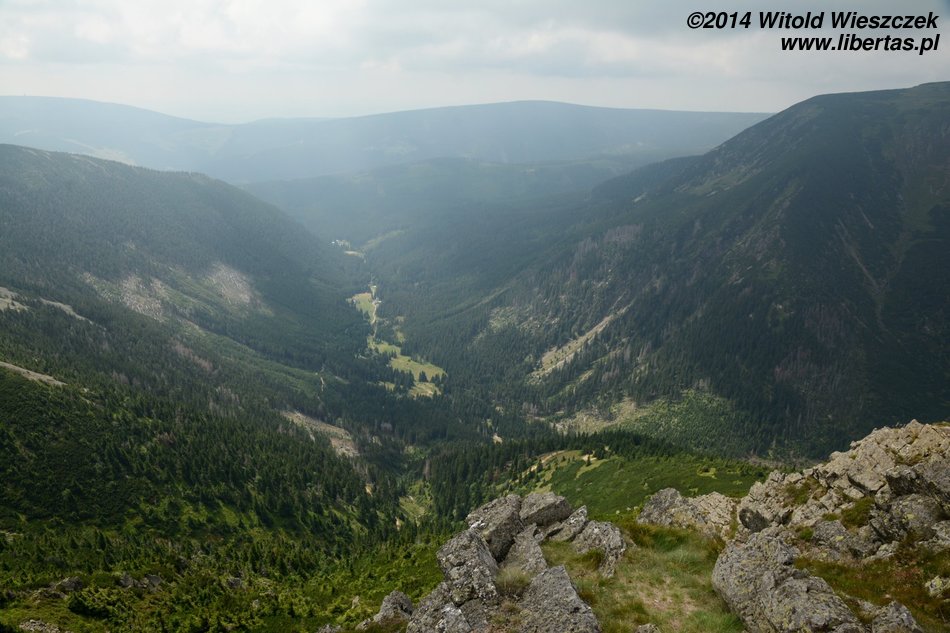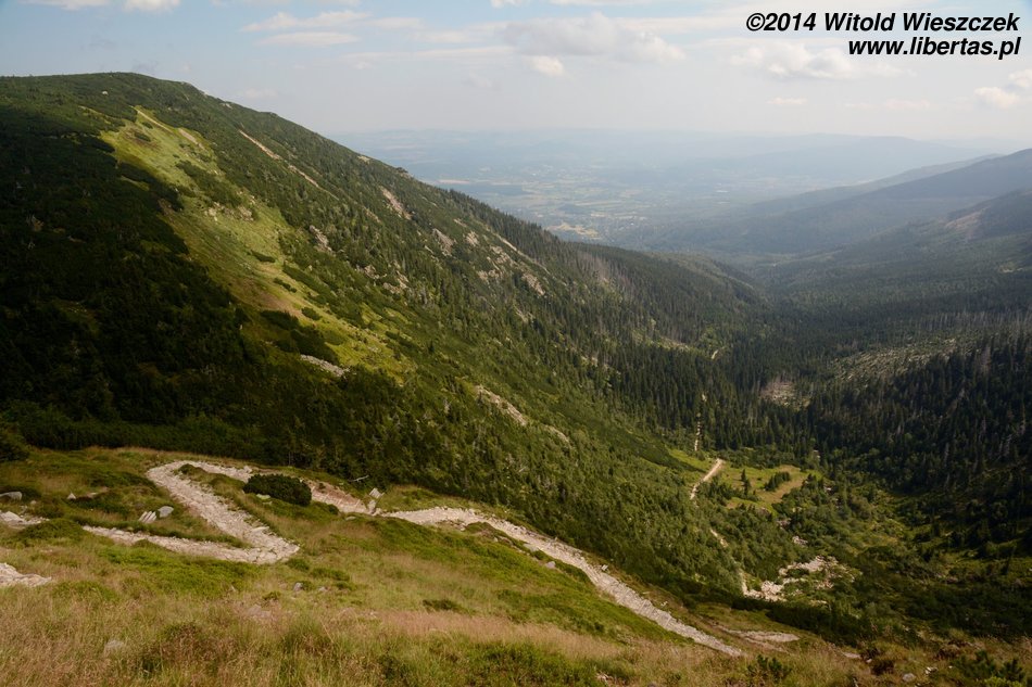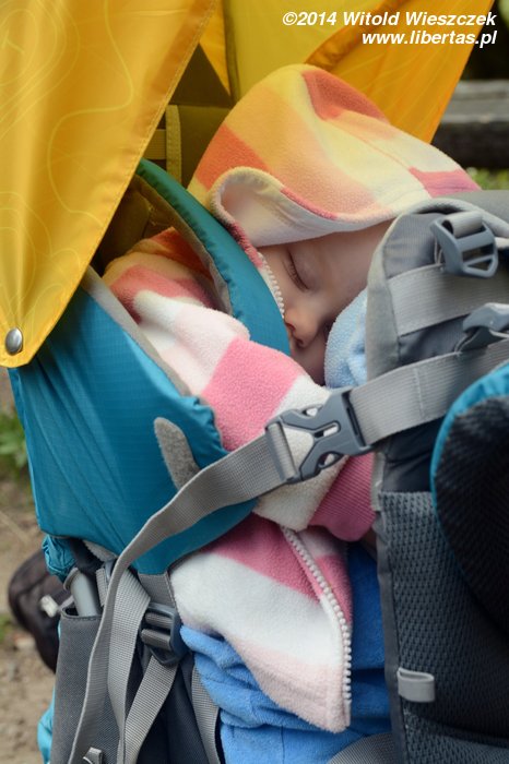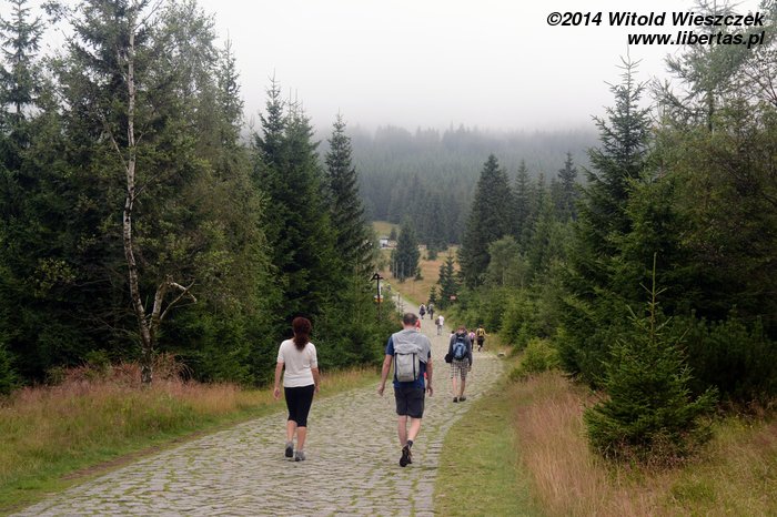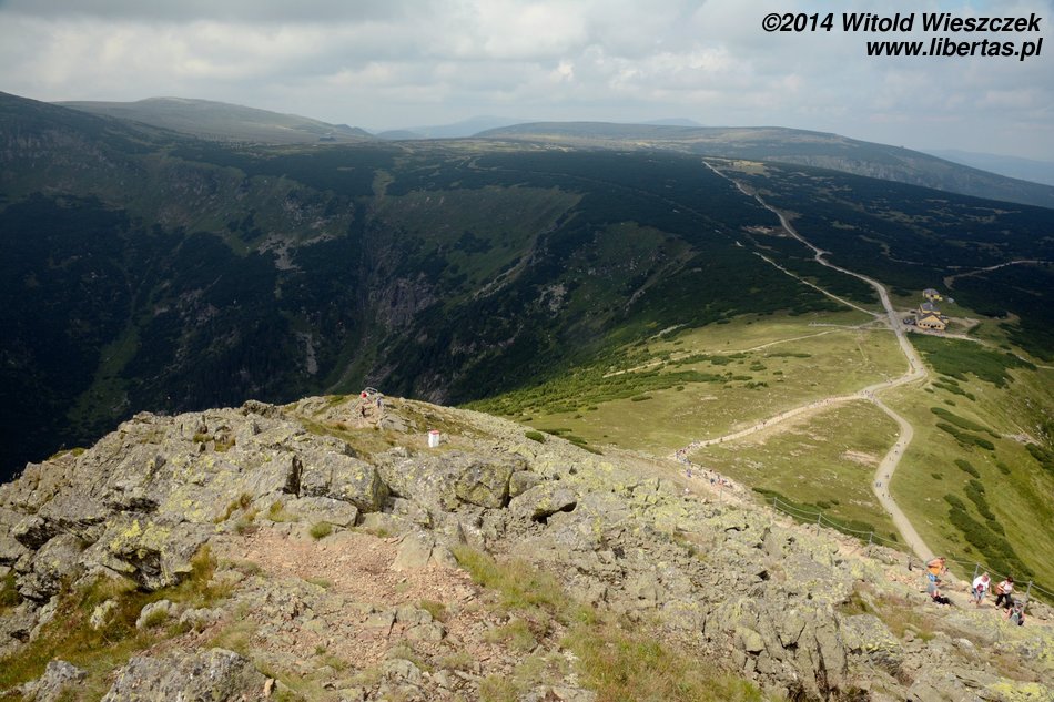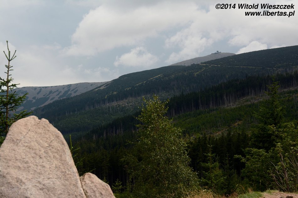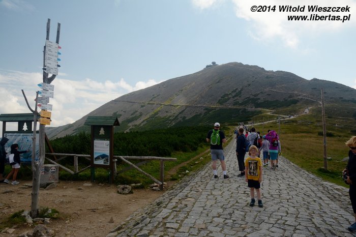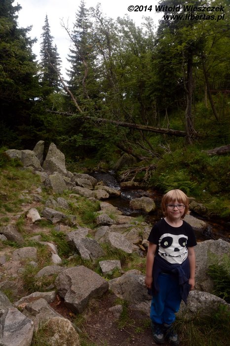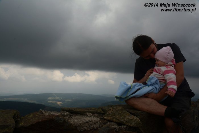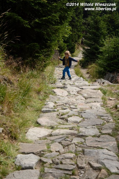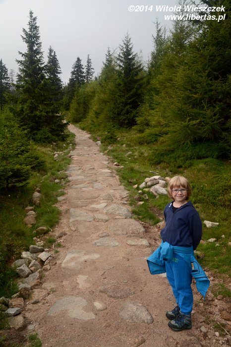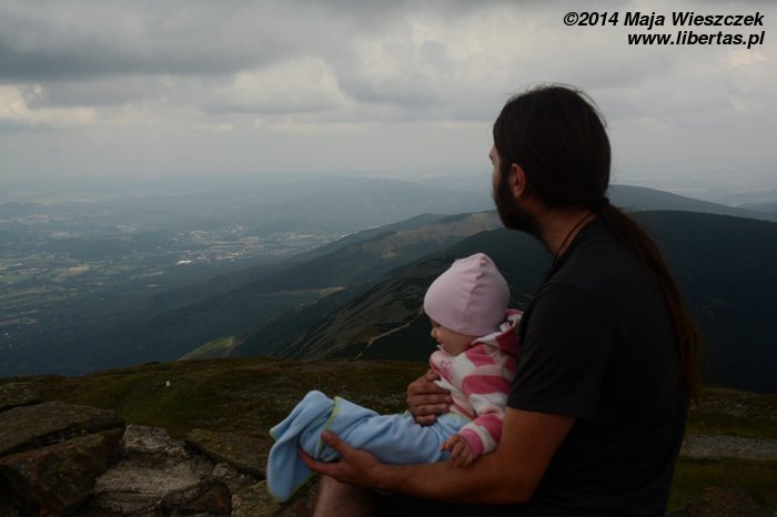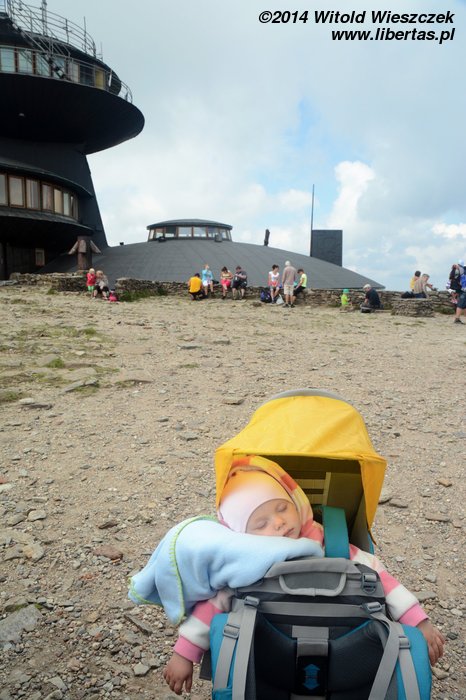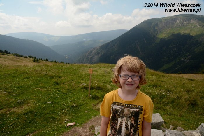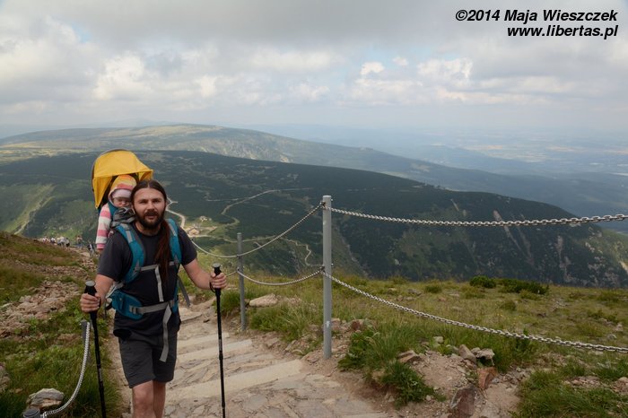 Pogoda nam się udała, słońce pięknie świeci, ale za gorąco nie jest. Tak w sam raz. Jeremi tradycyjnie musi sobie ponarzekać, że bolą go nogi, więc kiedy przeszliśmy Łomniczkę i momentami całkiem nieźle było już widać szczyt, pokazałem mu cel naszej wycieczki. Wydawało mi się, że ucieszy go to, że jest już tak blisko. To był błąd. Okazało się, że w jego skali była to odległość ogromna! Zamiast się ucieszyć, wpadł w otchłań rozpaczy i nie chciał dalej iść. Ruszył z miejsca tylko dlatego, że bał się zostać sam. Początkowo wlókł się noga za nogą jak skazaniec, ale szedł, a z czasem nawet rozwinął jakąś sensowną prędkość! Na szczęście Dobrawa grzecznie siedziała w nosidle, więc my wysokość pokonywaliśmy całkiem sprawnie. Dzieci potrafią być naprawdę bardzo silne i zapewniam, że 7-letni chłopczyk na Śnieżkę jest się w stanie o własnych siłach wdrapać. O ile oczywiście rodzice nie wsadzą go do wyciągu.