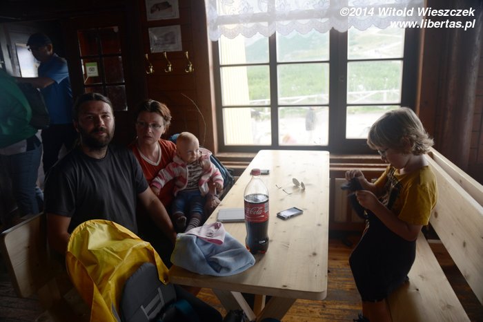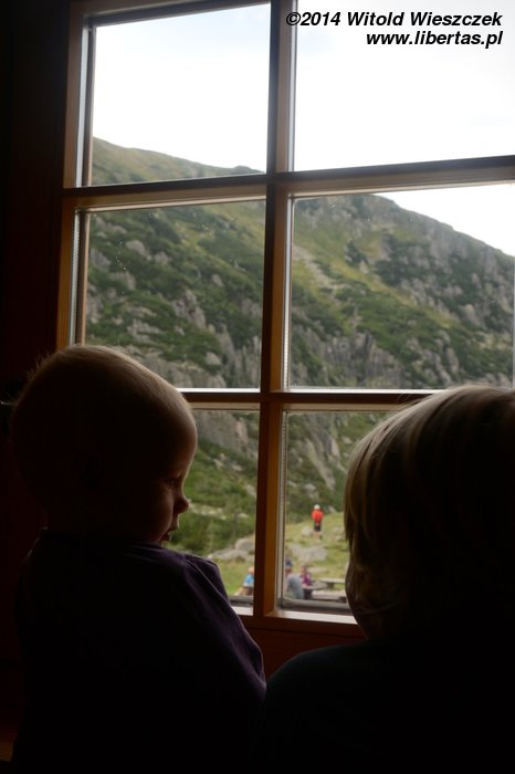 Dochodzimy do Małego Stawu, nad którym znajduje się schronisko Samotnia. Piękne miejsce, że aż chciałoby się zostać na noc. Trochę żałuję, że nie zdecydowałem się jednak na wędrówkę od schroniska do schroniska. Niby wiem, że z Dobrawą byłoby ciężko i trzeba byłoby ze sobą nieść kupę dodatkowych rzeczy, ale może byłoby to możliwe? Drogę w nosidle znosi bardzo dobrze, a i Jeremi, jak chce, to potrafi całkiem szybko maszerować!
