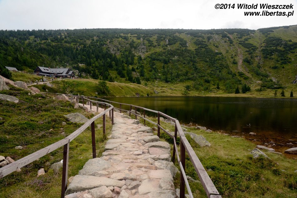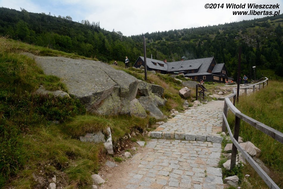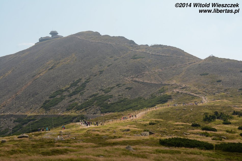 Przy Symbolicznym Cmentarzyku Ofiar Gór mijamy niewielką grupkę piechurów, ale w zasadzie poza nimi i parą na początku marszu, nikogo dotąd nie spotkaliśmy. Bałem się, że w szczycie sezonu będzie gorzej! Nieopatrznie mówię to na głos. W złą godzinę. Dochodzimy do schroniska na Przełęczy Pod Śnieżką, gdzie krzyżują się szlaki. No i to by było na tyle, jeśli chodzi o ciszę i spokój.