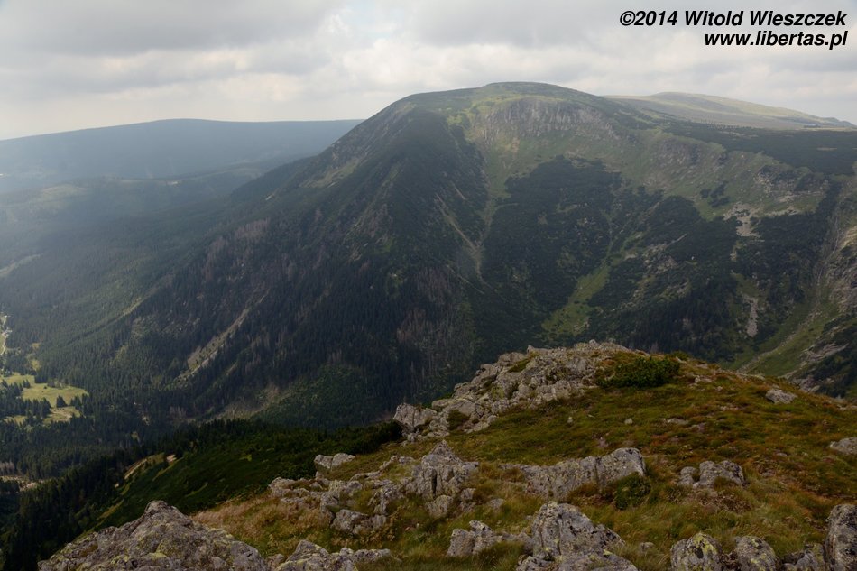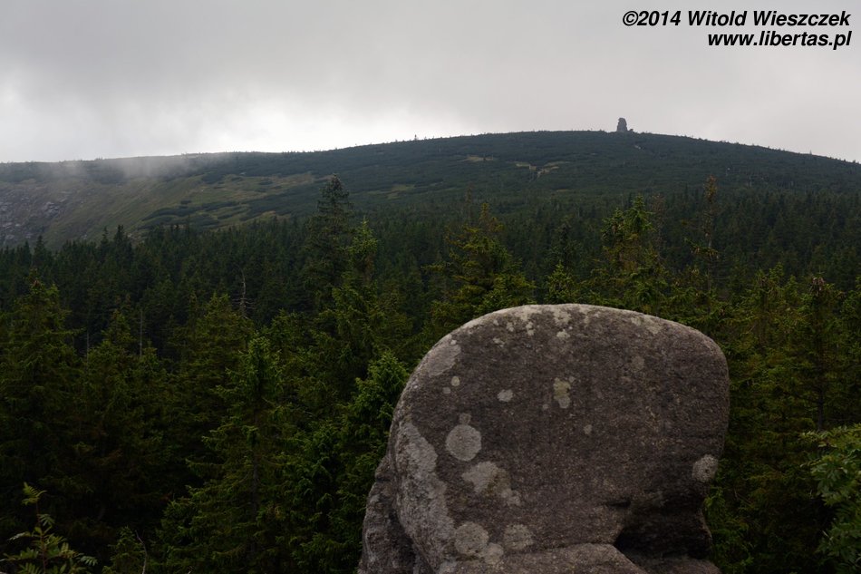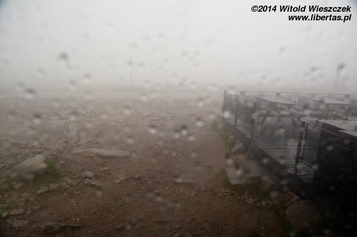 Jesteśmy na szczycie! Wszyscy byli dzielni i teraz w nagrodę możemy podziwiać... innych turystów. Ale tłok! Mówiłem, żeby wyjść wcześniej! Widok ze szczytu jest piękny, ale od czeskiej strony płyną ciemne chmury. To imponujące, jak szybko w górach zmienia się pogoda. Było tak pięknie, a za chwilę będzie lać! Wchodzimy do środka, a Jeremi zdobywa upragnioną pieczątkę – góry mają jednak też jakieś zalety! Niestety nie zapowiada się, żeby miało przestać padać, więc ostatecznie schodzimy już w deszczu.