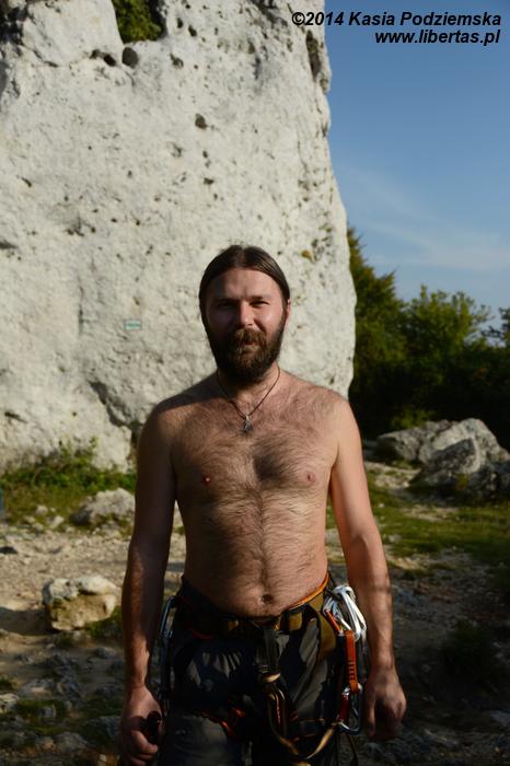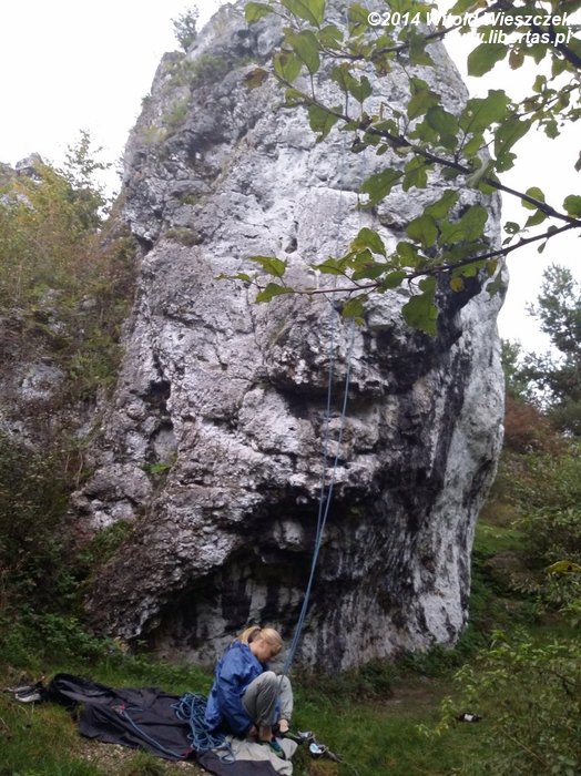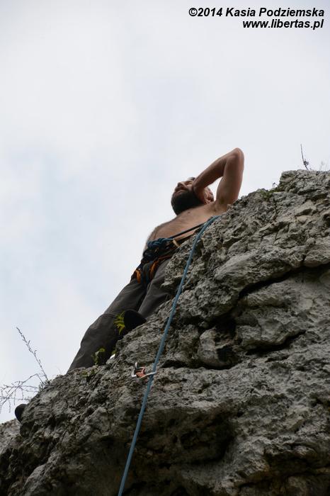 Kasia znowu się ze mnie śmieje! Dopiero co powiedziałem, że magnezja na naszym poziomie nie jest kompletnie potrzebna, bo przecież VI.2 nie prowadzimy, a na łatwych drogach chwyty są z reguły jak po zbóju, w dodatku często już upaprane magnezją. No dobrze, może tym razem by pomogła, ale kupować magnezję dla jednego przejścia na cały rok? Bez sensu! Dam radę bez! Z powodu jednego incydentu nie musimy się od razu stawać jakimiś magnezjowymi onanistami, co to używają jej nawet na trójkach, sypiąc nią przy okazji na wszystkich wokół. Przed drugą próbą ambitnie wypiąłem pierwszy ekspres i zacząłem zupełnie od początku, ale po kolejnym locie, utracie czucia w prawym palcu serdecznym i kontroli nad zaciskaniem lewej ręki, postanowiłem aż tak zasadniczy nie być. W końcu za trzecią próbą się udało, no ale lina była już w pierwszym ekspresie, więc RP nie ma. Jest za to kontuzja. Mam nadzieję, że jutro będę mógł się wspinać!