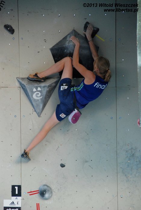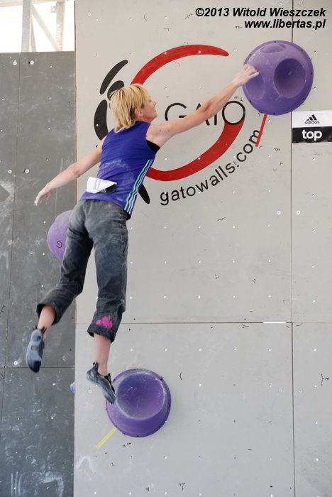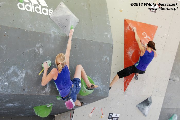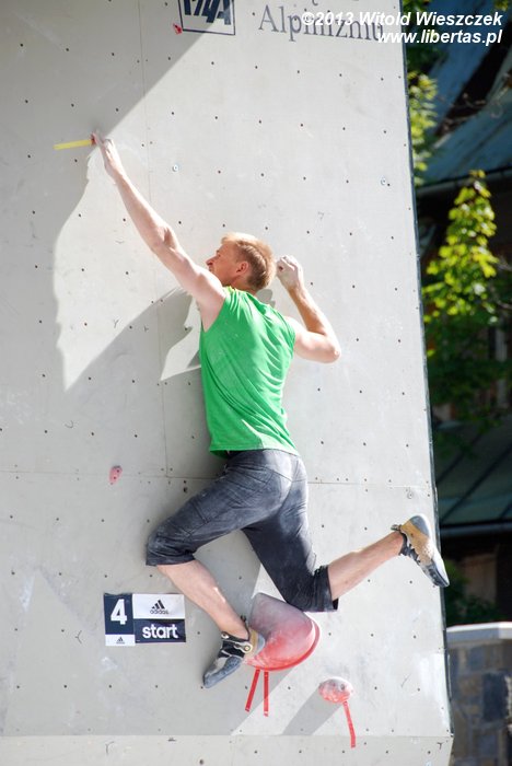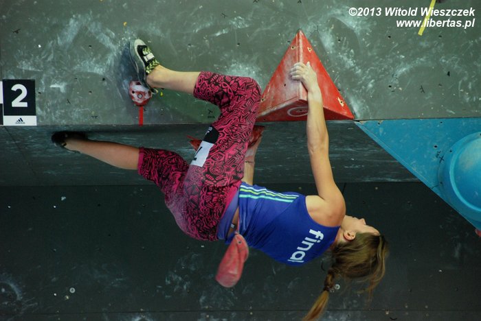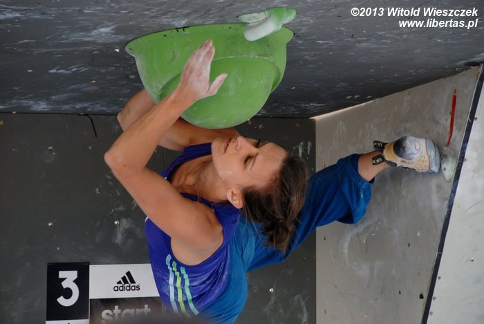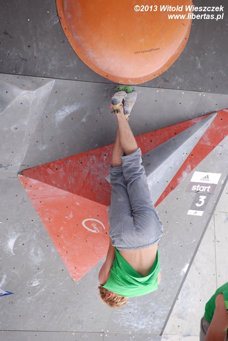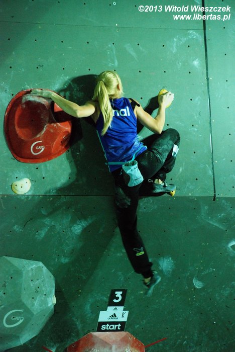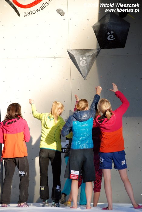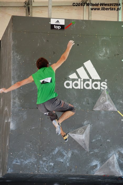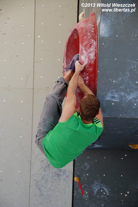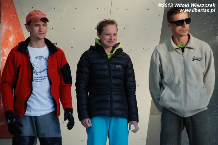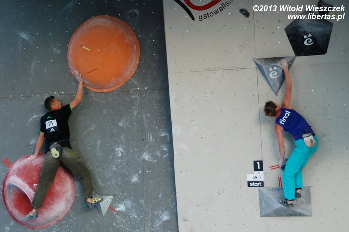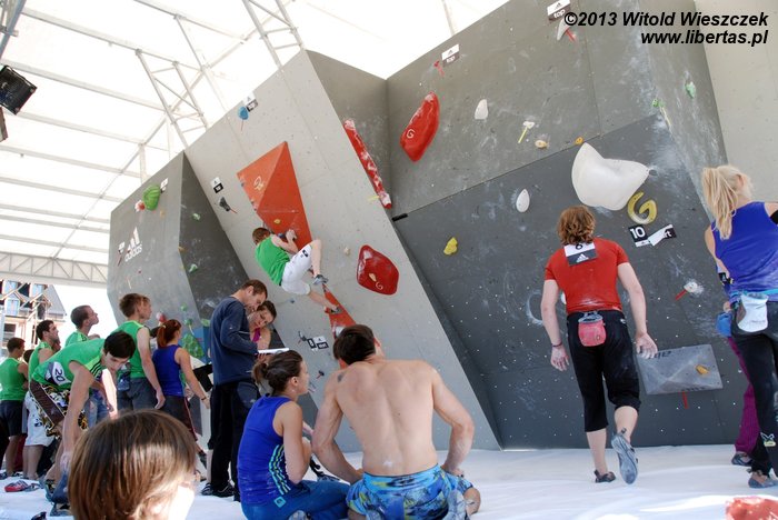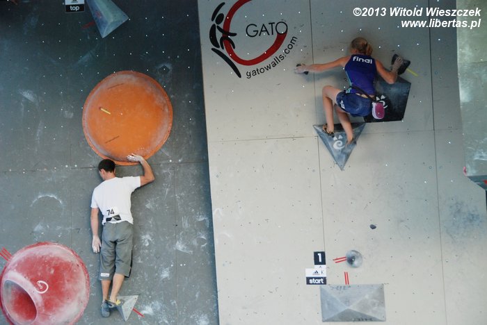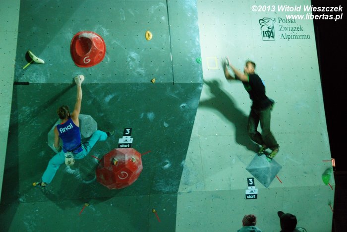 W niedzielę obejrzeliśmy kilka całkiem niezłych filmów. Najbardziej przypadł mi do gustufilm pt.: Himalaje: Wioska w której zatrzymał się czas. Bardzo spodobał mi się także zdobywca nagrody naczelnika TOPR – Silbergeier. A potem były już tylko zawody. Najpierw półfinały, w których najlepiej wypadła Kinga Ociepka-Grzegulska (wśród kobiet) i Tomasz Oleksy wśród mężczyzn. Drogi jednak były bardzo trudne, zwłaszcza te przygotowane dla panów i na początku można było podziwiać głównie frustracje zawodników. Ostatecznie chyba nawet jeden top pozostał niezdobyty.