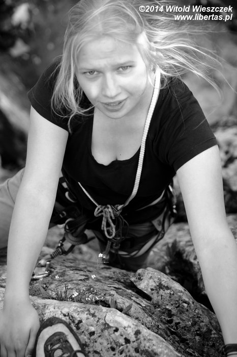 Tymczasem pojawiają się Basia i Kuba, więc zapowiada się miły towarzysko dzień. Oni wybierają się na Dziurawą, a my mamy w planie Rysę Kirkina, ale pod Leśną udajemy się już razem, gdzie korzystając z okazji, że ktoś inny może asekurować, robię Kasi sesję podczas prowadzenia Lewego komina leśnej.