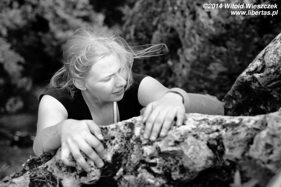 Na Kamieniu przed Leśną Kuba z Basią robią jakieś VI.1, więc próbuję zrobić to na wędkę, z akcentem na próbuję. Niby wczołguję się na szczyt, ale nie nazwałbym tego przejściem. Więcej wiszę, niż się wspinam. VI.1 to, póki co, dla mnie zupełny kosmos. Dzień kończymy na Faszystowskim, gdzie po raz pierwszy prowadzę Krwawy Palec. Ale niestety z dwoma postojami na linie, więc na RP jeszcze za wcześnie. Kasia na razie patentuje na wędkę, ale pewnie niedługo i jej uda się to poprowadzić. Raz już była blisko.