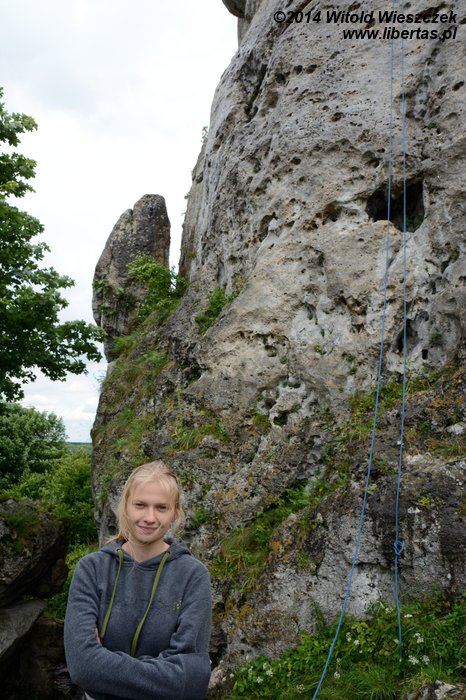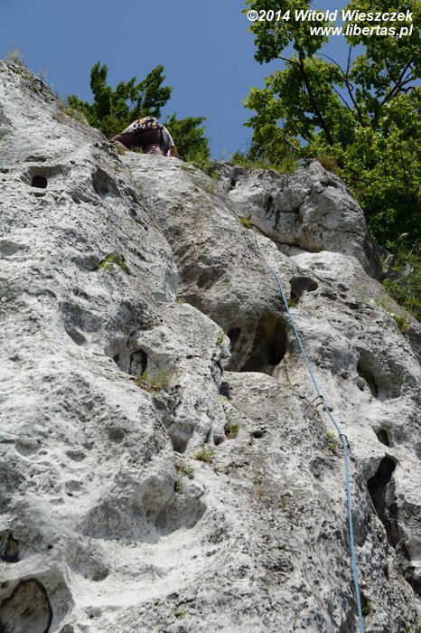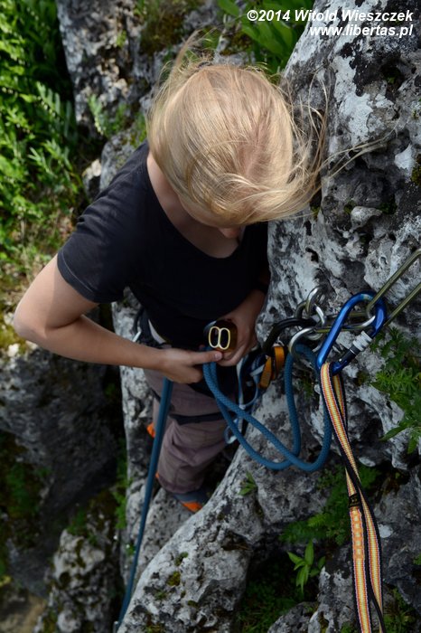 Jakoś tak się złożyło, że ostatnio zawsze zaczynamy od Zegarowej – jest po drodze, niezbyt męczy, idealna na przystawkę. Po tradycyjnej rozgrzewce na piątce i szóstce, postanawiamy zrobić sobie biegnącą obok czwórkę Rećko – głównie na własnej (1 spit). Idzie całkiem nieźle i tylko przy zjeździe pojawiają się problemy. No ale dodajmy, że startowaliśmy z domu przed siódmą, a Kasia imprezowała do czwartej rano, więc dobrze, że w ogóle pamięta, jak się wiąże ósemkę!