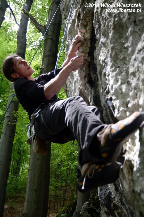 W końcu się udało! Nie wdając się w szczegóły naszych porannych rozgrzewek, które ostatnio wyglądają dość podobnie, mogę się w końcu pochwalić czystym poprowadzeniem Sąsiadów (VI) RP. Jestem z siebie dumny, co chyba widać na zamieszczonym obok obrazku. Kasia kręci nosem, że walczyłem, że niby mogło być ładniej. Może i racja, ale na linie nie wisiałem, ringów nie dotykałem, z drogi nie uciekłem. RP jest, a ładniej będzie następnym razem. W końcu teraz kolej Kasi, więc na pewno jeszcze się tu pojawimy.
