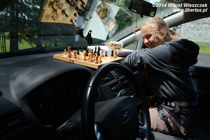 Zdegustowani ilością ludzi postanowiliśmy następnego dnia pojechać do Łutowca. Tam na rozgrzewkę zrobiliśmy Łyk szczęścia (V), a później na wędkę mierzyliśmy się z wytyczoną obok drogą o nazwie Adrenalina Skoczyła (VI.1). Ledwie zrzuciliśmy linę, a zaczęło padać. W ostatniej chwili schowaliśmy się pod Minogami, ale rozlało się na dobre i nawet tam nie byliśmy bezpieczni. Gdy ulewa trochę zelżała, postanowiliśmy pobiec do samochodu, ale pogoda tego dnia wykazywała ogromne poczucie humoru i gdy dobiegliśmy do celu, przestało padać, a nawet wyszło słońce. Chwilę odczekaliśmy, grając w szachy i wróciliśmy pod skały, po czym uciekliśmy przed kolejną falą deszczu. Powtórzyliśmy tę drogę trzy razy, zanim pogodzie zabawa się znudziła.