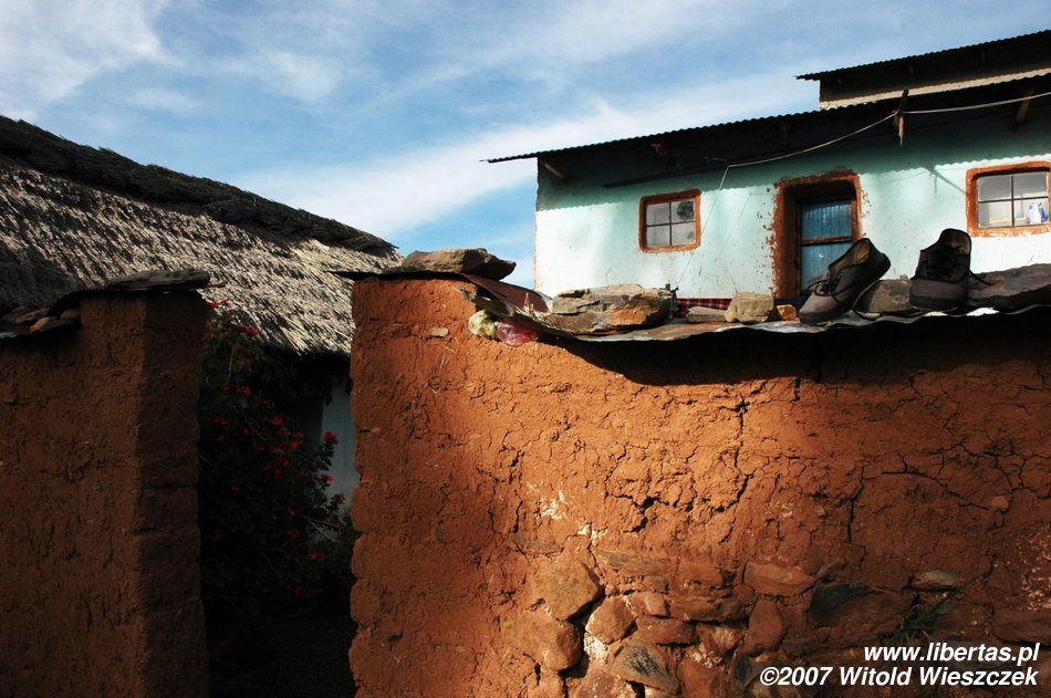 Po obiedzie oglądamy wyspę, nie zawsze widok jest przyjemny, kilkoro dzieci zaczepia mnie o pieniądze. Wszystkie domy wybudowane z glinianej cegły suszonej na słońcu, jestem trochę zdziwiony, gdy w jednym z takich niezbyt dobrze wyglądających domów widzę bardzo solidne, świetnie zrobione dębowe drzwi! Niektóre z tych domów zamiast drzwi mają blachę falistą! A tutaj idealnie wprawione, rewelacyjne drzwi! Byłem w takim szoku, że z wrażenia nie zrobiłem zdjęcia, niestety...