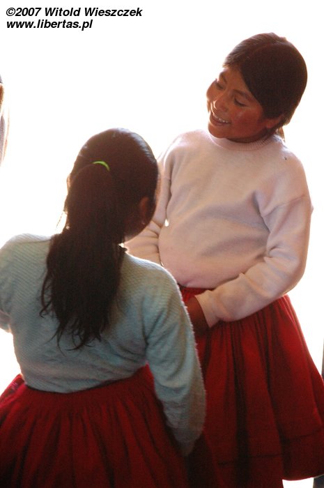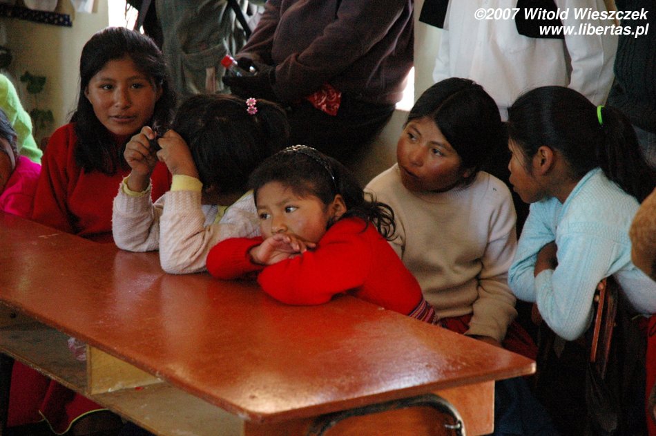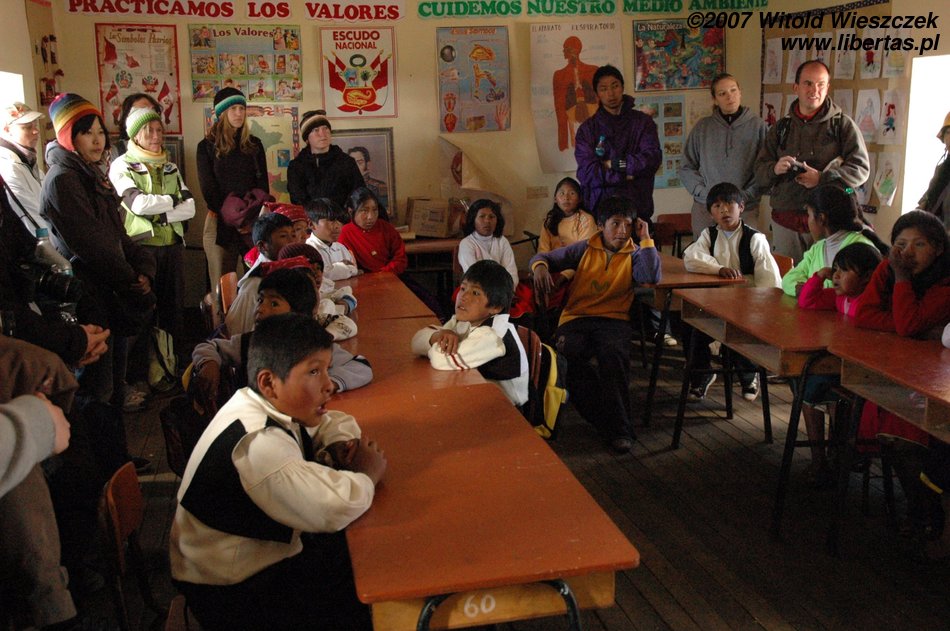 Na wyspie odwiedziliśmy szkołę. Dzieci musiały przez nas przerwać grę w piłkę i wejść do środka. Nauczycielka wygłosiła krótkie przemówienie powitalne, a później namówiła dwie zawstydzone, ubrane w czerwone spódniczki dziewczynki, by zaśpiewały piosenkę dla turystów.