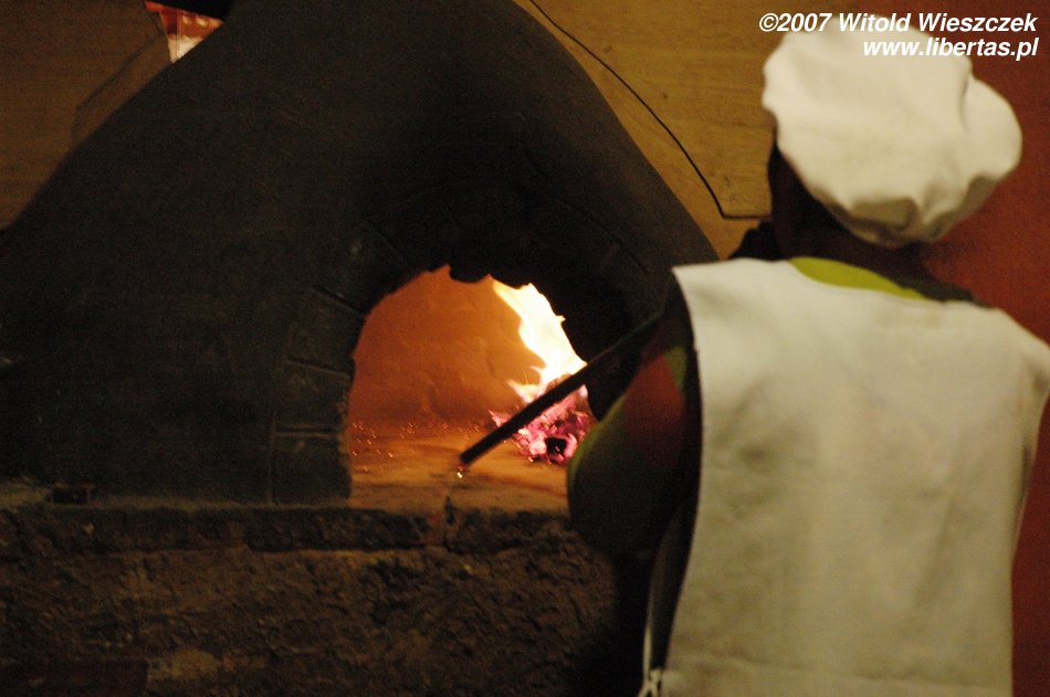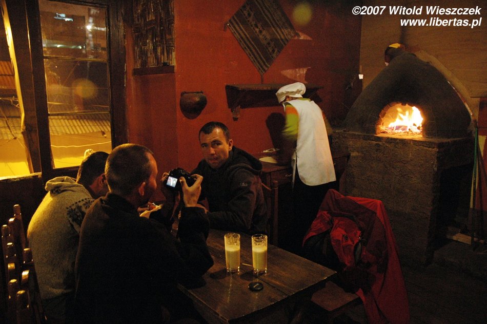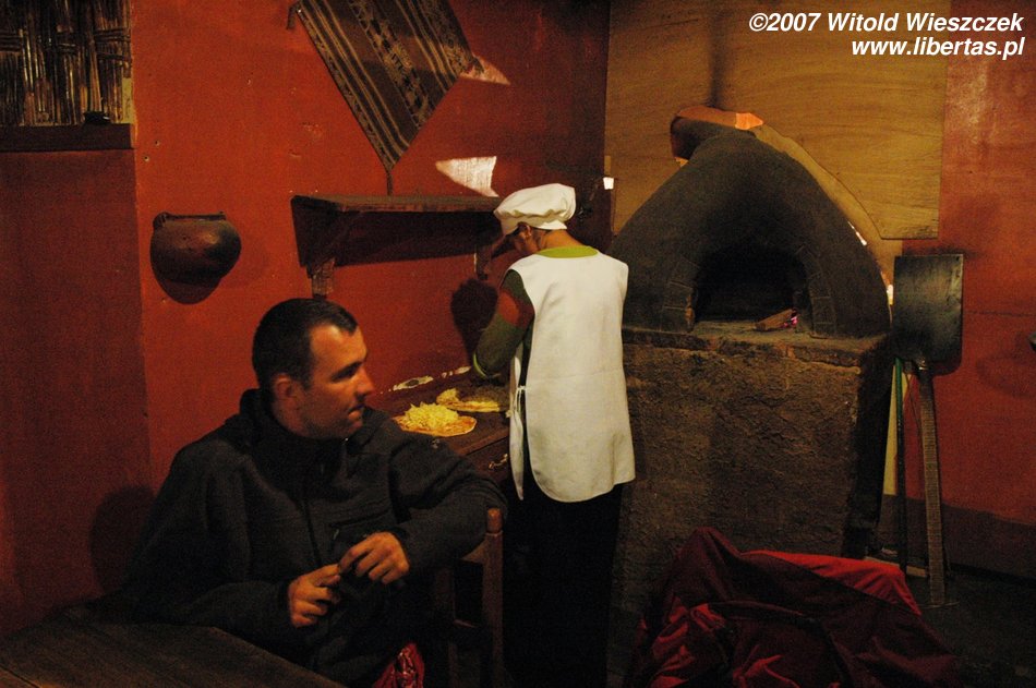 O dwudziestej ma po nas przyjechać taksówka, która zabierze nas na autobus do Cusco, mamy czasu tylko tyle, żeby się przepakować i coś zjeść. Przez ostatnie dwa dni nie jadłem zbyt syto, więc widok pizzy ucieszył mnie szczególnie. Mało tego pizza bardzo mi smakowała, nic dziwnego, pani najpierw starannie rozgrzała piec opalany drewnem, później włożyła do niego na chwilę ciasto, żeby wyrosło, następnie je uformowała i wrzuciła razem z dodatkami do ostatecznego wypieku.