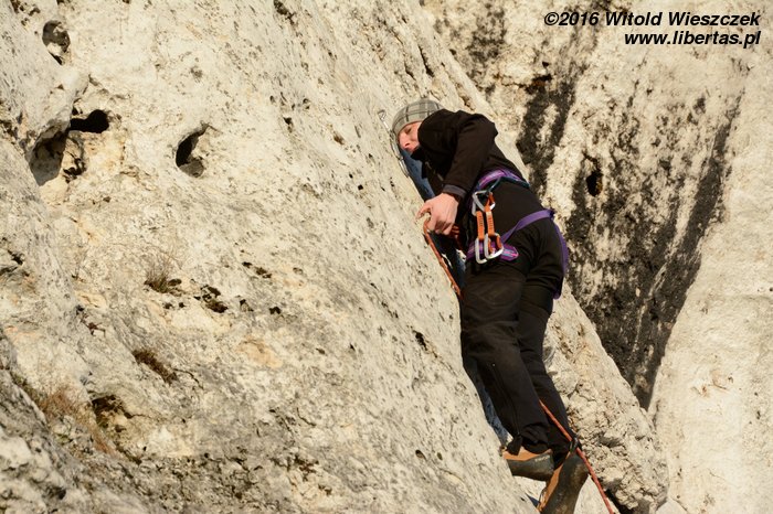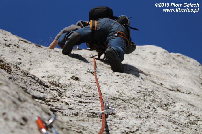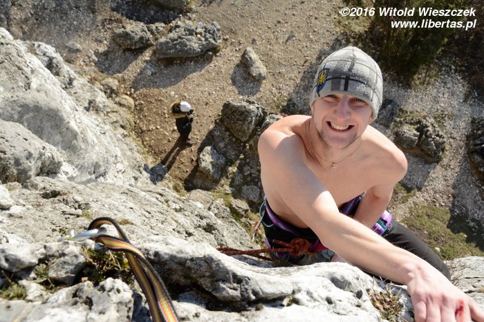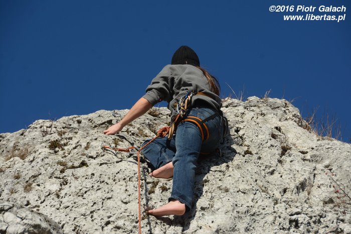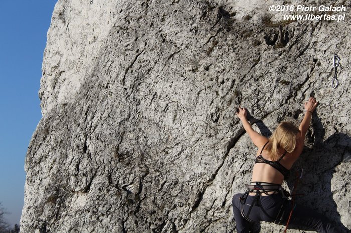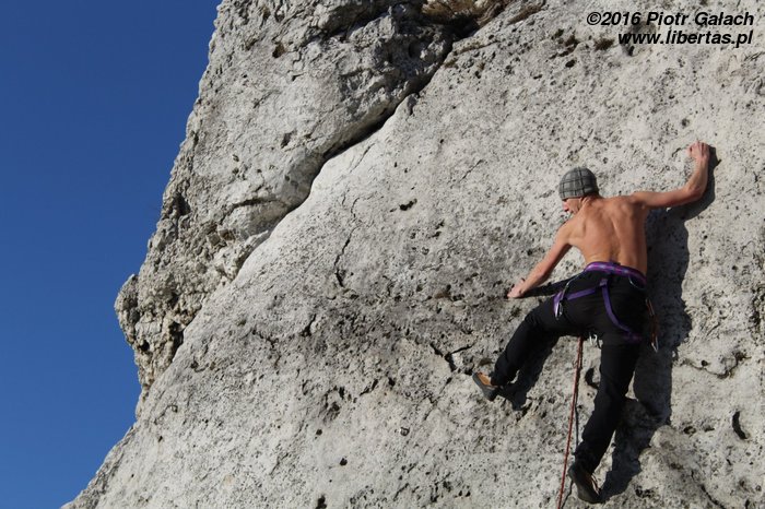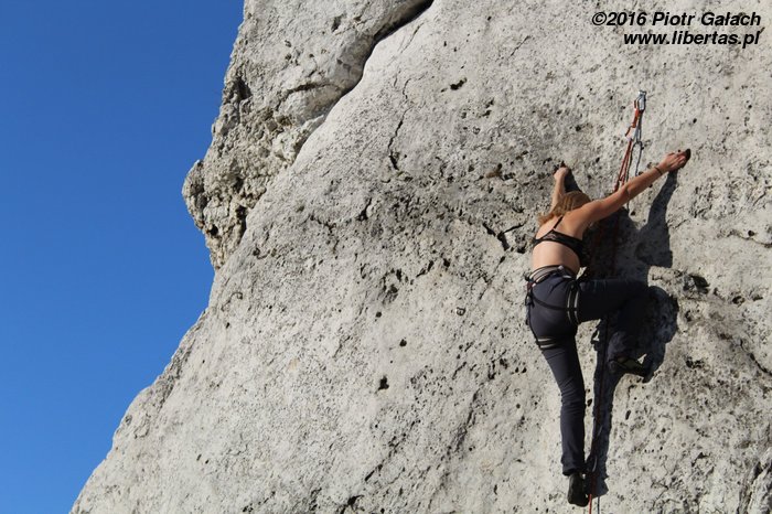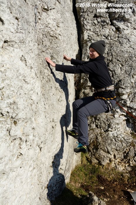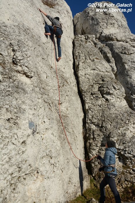 Przez to całe zamieszanie przyjeżdżamy 10 minut po czasie. To pierwsze i – obiecujemy – ostatnie nasze spóźnienie w tym roku! Piotrek się nie gniewa. Otwieramy piwa pod Zegarową i wstawiamy się w pierwszą drogę, gdy przychodzi Kasia Druga. Kasia trochę się spóźniła, ale jest z Warszawy, więc jej wybaczamy. Mało tego, że się spóźniła, to jeszcze zapomniała szpeju! Nawet uprzęży! Takim wariatem to nawet ja nie jestem. Kasia Druga mówi, że impreza w nocy była ostra i reszta towarzystwa jeszcze nie żyje, więc i tak jest dobrze. No to dobrze.