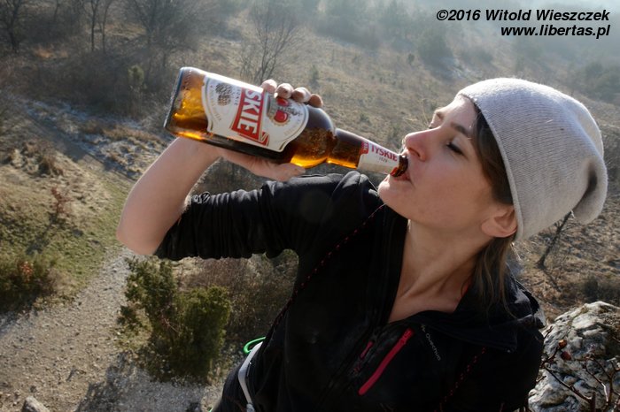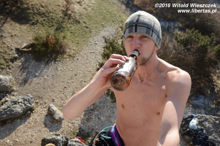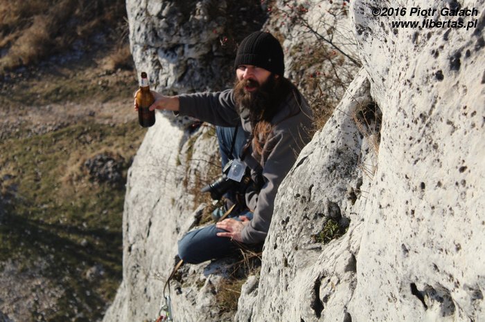 Jesteśmy spragnieni, więc wspinamy się szybko i sprawnie. No i wiadomo, z okazji Sylwestra każdy chce się zaprezentować jak najlepiej. Ja idę bez butów, bo zapomniałem wypastować. Ale to pikuś. I tak najtrudniej jest wejść na górę z otwartym piwem w woreczku na magnezję. Jeszcze nigdy się tak nie bałem, że polecę, ale nie uroniłem nawet kropli!