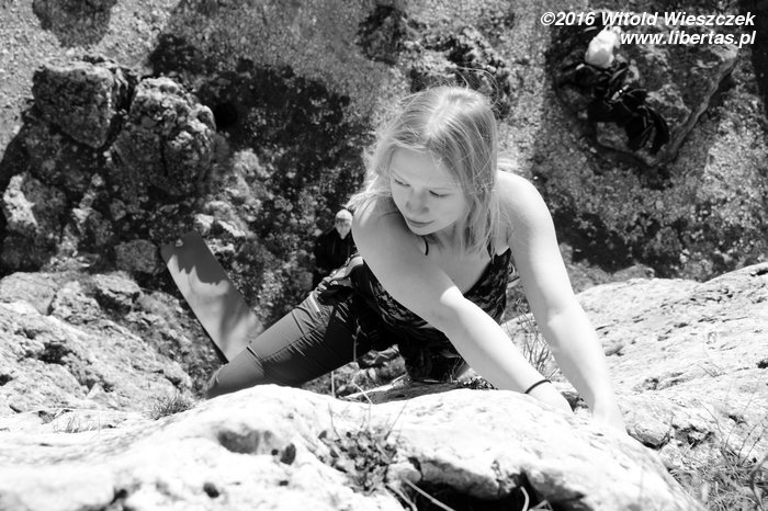 Piotrek bez koszulki, bo oczywiście każdy rasowy wspinacz wspina się bez koszulki i w czapce, zwłaszcza przy wspinaczkach płci odmiennej. Dodatkowo specjalnie rozwala sobie palec – nic nie podnieca kobiet bardziej niż świeża krew! Kasia Pierwsza i tak bije nas wszystkich na głowy, no ale ona mocno oszukuje. Wiedziała, że na koniec sezonu będziemy się wspinać bez koszulek, więc założyła koronkowy stanik!