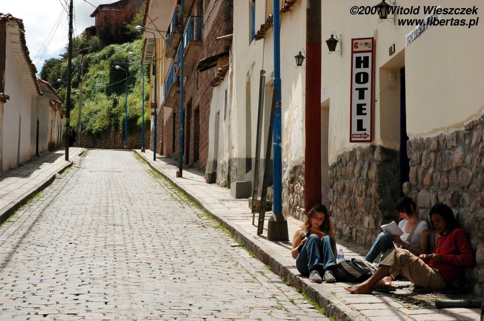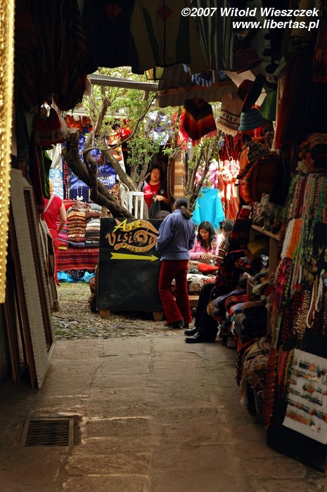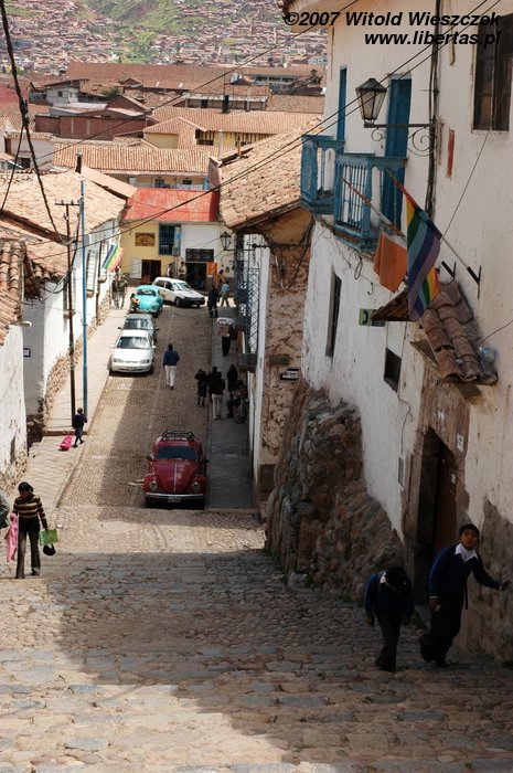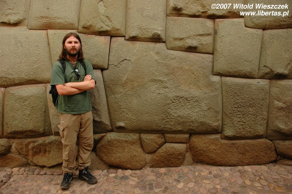 Nadal jednak można podziwiać mistrzostwo inkaskich budowniczych, jakaś dziejowa sprawiedliwość sprowadzała tutaj często trzęsienia ziemi, które niszczyły hiszpańskie świątynie, nie naruszały jednak ich inkaskich fundamentów. Inkowie nie używali zaprawy, dopasowywali jednak do siebie kamienie tak starannie, że w szczeliny między nimi nie można włożyć włoska! Nie są im straszne żadne trzęsienia ziemi! Przykładem tego mistrzostwa jest słynny dwunastokątny kamień (na zdjęciu powyżej) znajdujący się w murach pałacu należącego do Inki Rocy, przerobionego przez Hiszpanów na Bóg jeden wie co. Jak sobie pomyślę, że oni uważali siebie za cywilizowanych ludzi, to mnie krew zalewa!