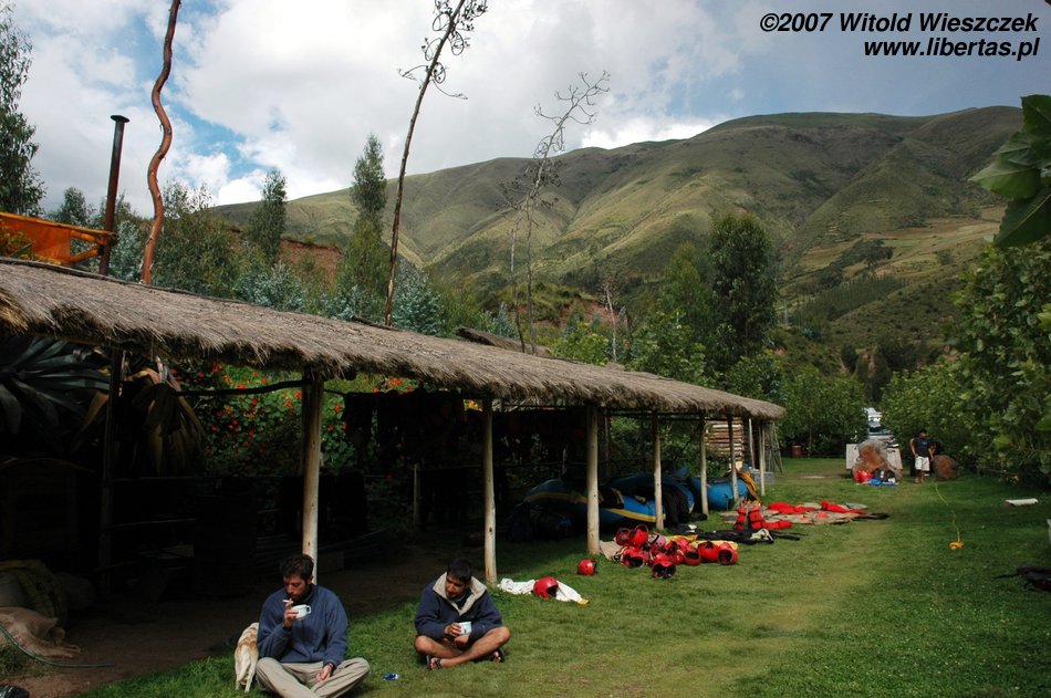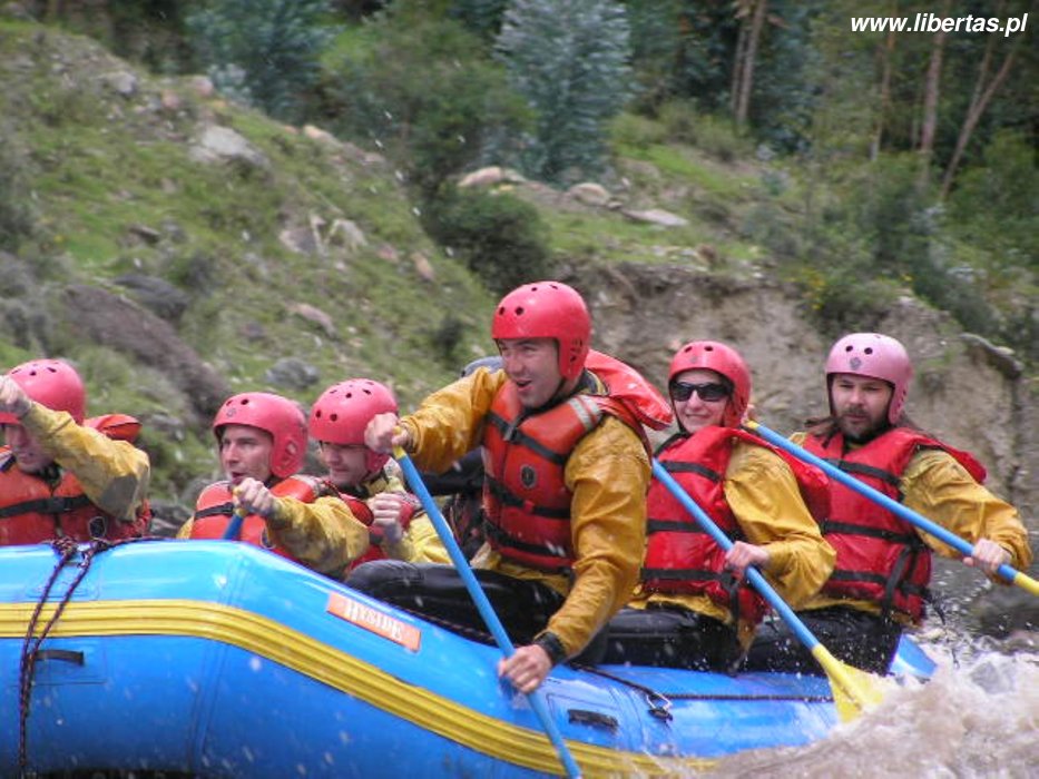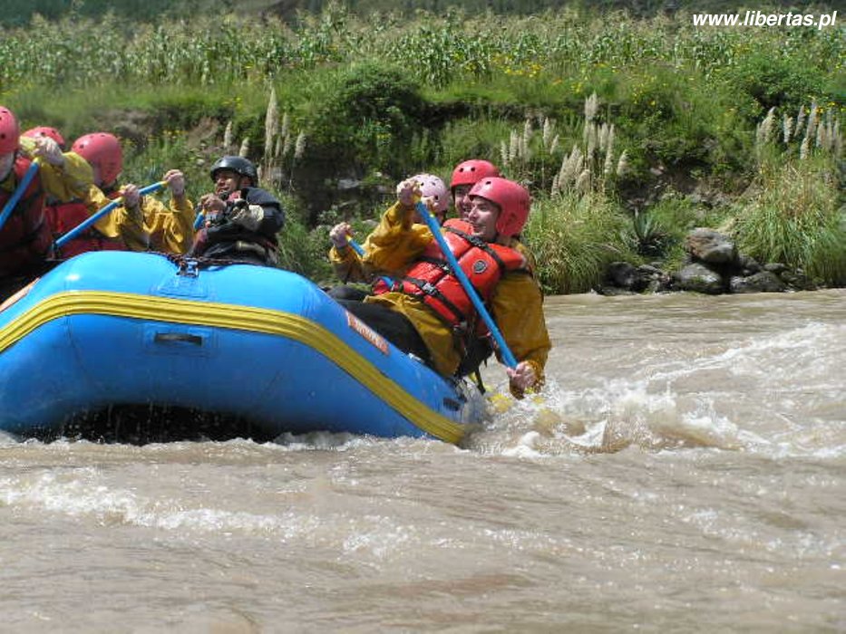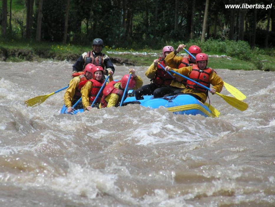 Rafting kosztuje 25$, czyli prawie darmo. Autobus zabiera nas z Plaza de Armas, nad rzekę jedziemy prawie dwie godziny. Dostajemy sprzęt, instrukcje na drogę (całe 5 komend) i pakujemy się do pontonu. Ku mojemu zaskoczeniu jest bosko! Oprócz nas w pontonie jest kapitan (jedyna doświadczona osoba), śliczna Natasha ze Szwajcarii i jakiś człowiek, któremu nie miałem okazji być przedstawiony.