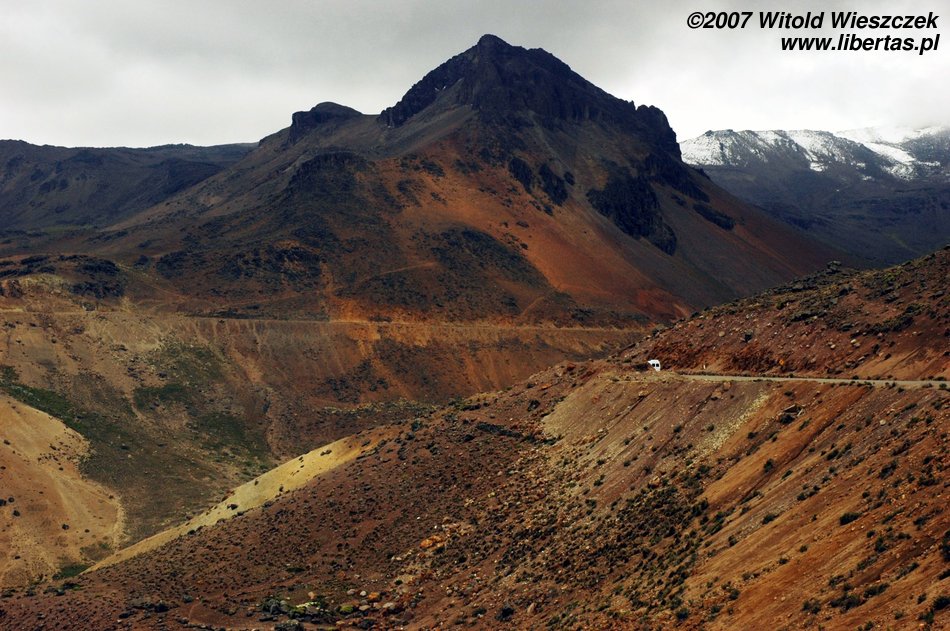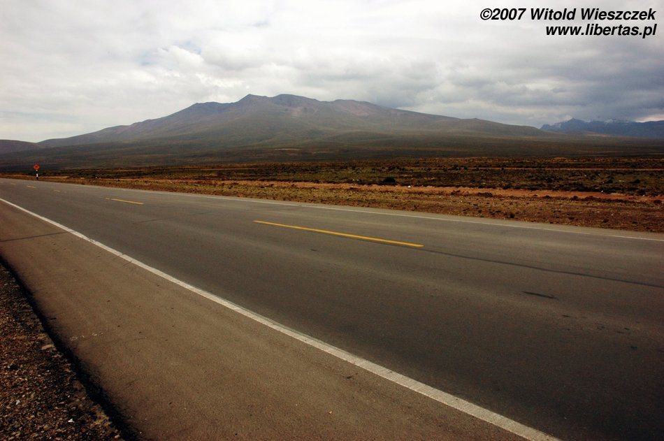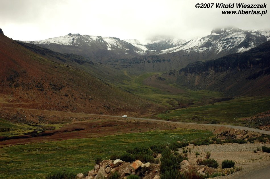 Jak już pisałem, Arequipa jest położona na wysokości 2398 metrów, dzisiaj dotrzemy do Chivay (3650 m n.p.m.), pokonując po drodze Przełęcz Wiatrów położoną na wysokości 4950m n.p.m.! A wszystko to busem widocznym na zdjęciu poniżej i w miłym towarzystwie dwóch bardzo sympatycznych Austriaczek – Elizy i Ewy, starszej pary z Quebecu oraz naszej przewodniczki oczywiście.