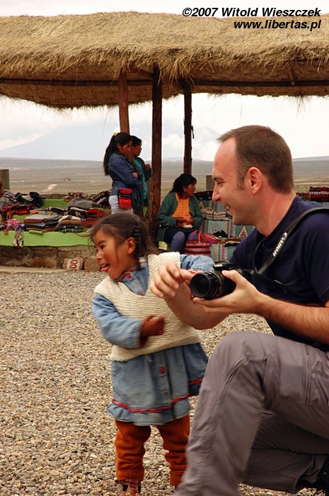 Po drodze odwiedzamy indiańską wioskę, gdzie można napić się mate de coca, a także zakupić jakiś sweter albo czapkę z bardzo ciepłej wełny z Alpaki. Ja oczywiście znowu nie mogę oderwać obiektywu od dzieci. Odwiedza nas też bardzo towarzyska lama, która rozbawia całe towarzystwo.