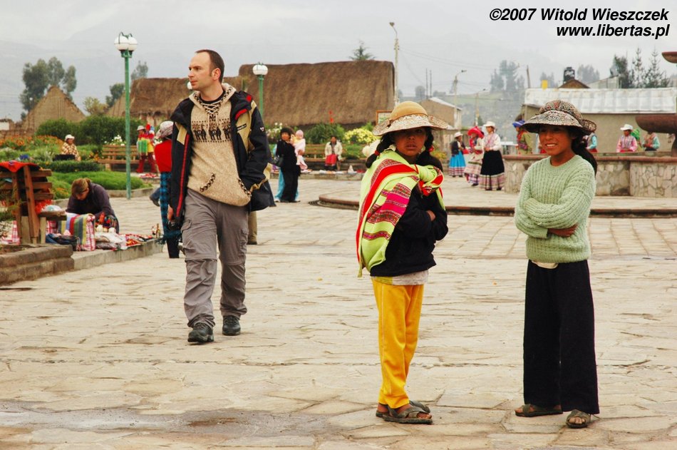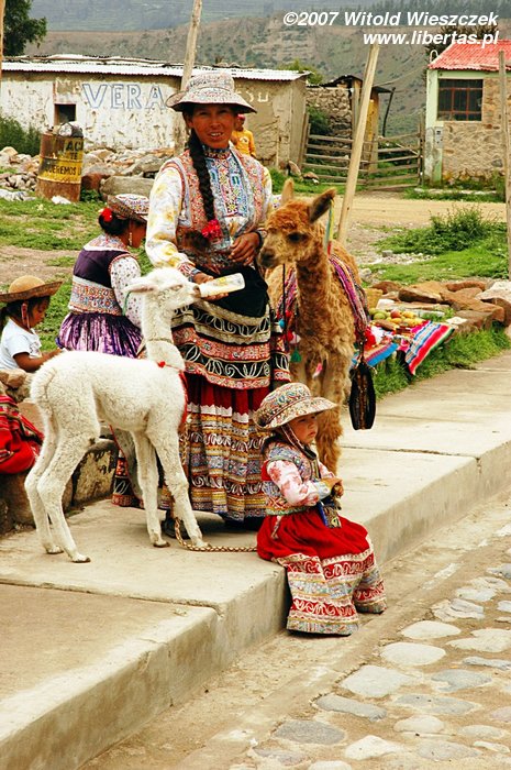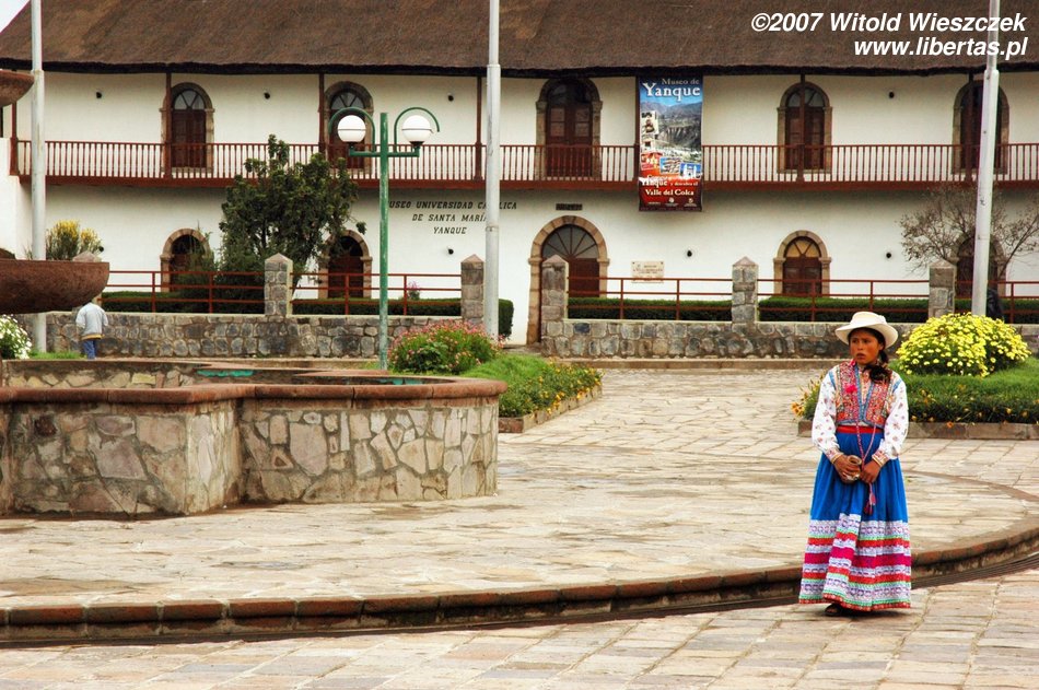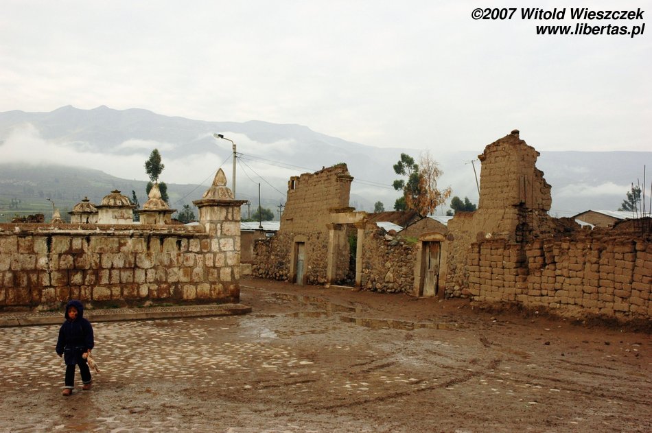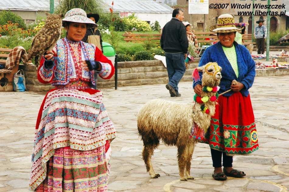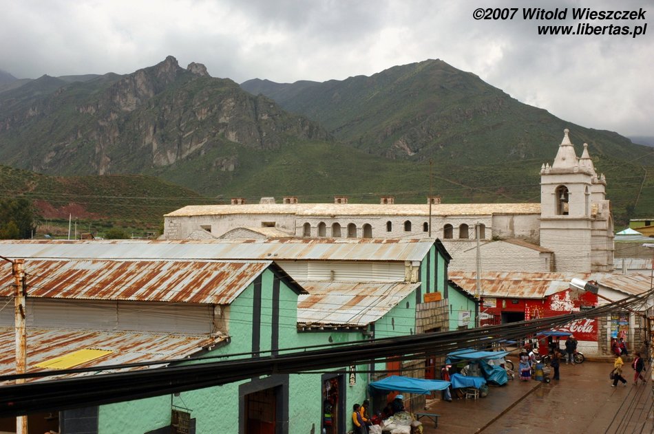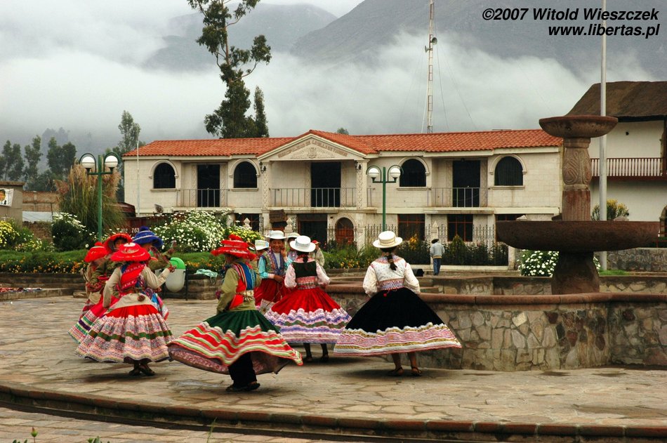 Dzisiaj jedziemy w położone na wysokości 3450 m n.p.m miejsce zwane Cruz del Condor, po drodze kilka razy zatrzymujemy się, by podziwiać zapierające dech w piersiach widoki. Odwiedzamy też Yanque, w którym znajduje się trochę podniszczony kościółek z unikalną na skalę światową barokową fasadą. Na (zgaduje w ciemno) Plaza de Armas tańczą dla turystów Indianki. Smutny jest widok zabiedzonej dziewczynki ze szmacianką, na i zrujnowanych lub niedokończonych domów na tle pięknych gór. Ten kontrast będzie mi towarzyszył przez całą podróż. Niesamowicie piękny kraj, wyeksploatowany przez białych do granic możliwości, najpierw okradziony ze złota, potem z miejsc kultu zamienionych na chrześcijańskie kościoły, w końcu z miedzi wydobywanej w niewolniczych warunkach dla zachodnich koncernów, a dzisiaj nawet firmy turystyczne, które zarabiają na turystach, często są spoza Peru. W głowie się nie mieści, ale do dzisiaj nadal okrada się tych ludzi!