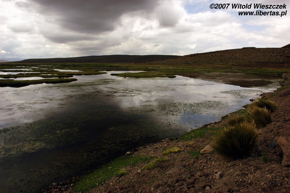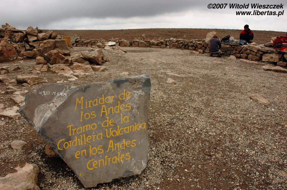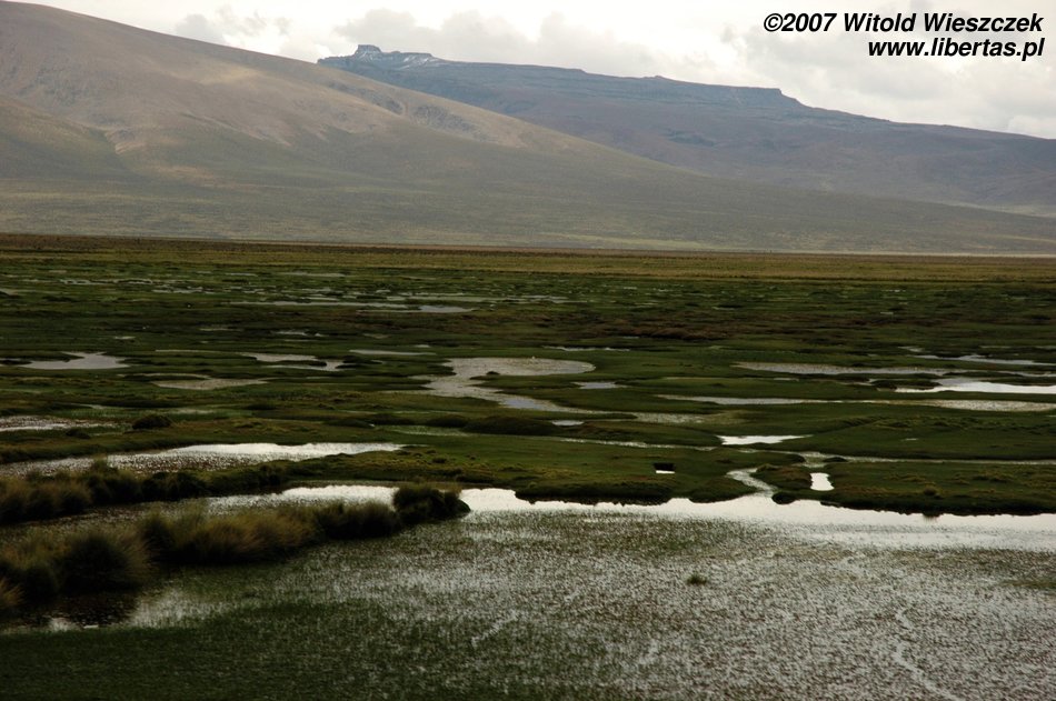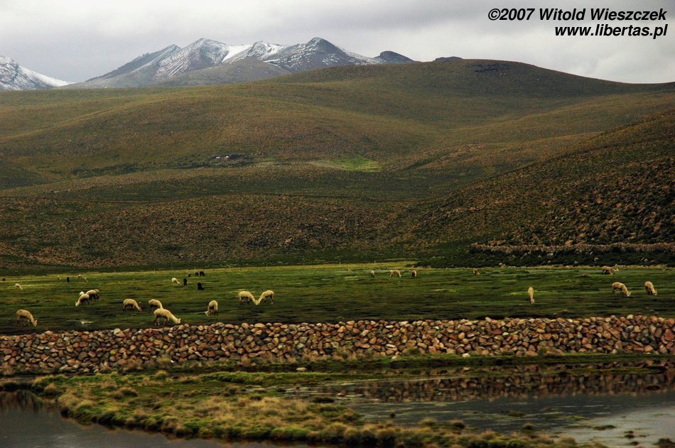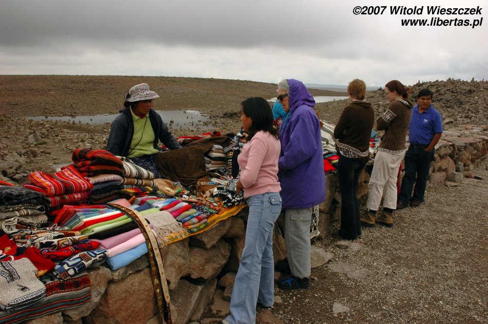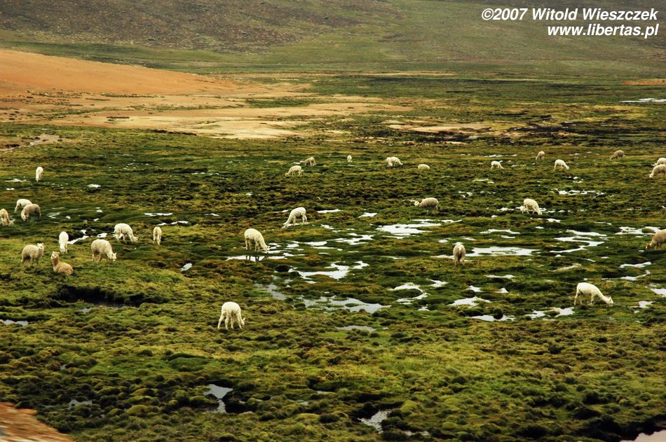 Później robi się zielono i pojawiają się lamy. Kiedy po raz któryś zatrzymujemy się podziwiać widoki, zdaję sobie sprawę, że chyba mam chorobę wysokościową i liście koki tylko trochę łagodzą jej objawy. Docieramy na przełęcz wiatrów położoną na wysokości prawie 5000 metrów. Tutaj nawet na prostej drodze po zrobieniu dwóch kroków brakuje mi tchu! Dookoła obficie wyrastają apachety. Każdy może taką zbudować z otaczających kamieni i złożyć w niej coś w ofierze dla Pachamamy – Matki Ziemi. Najczęściej składa się jej w ofierze to, co tutaj najcenniejsze, czyli liście koki. Budując, można się modlić do Pachamamy w jakiejś intencji, albo jak mówią gringos, mięć jakieś życzenie. Ledwie mogłem się schylać, ale jak bym mógł zrezygnować z modlitwy w takim miejscu!
