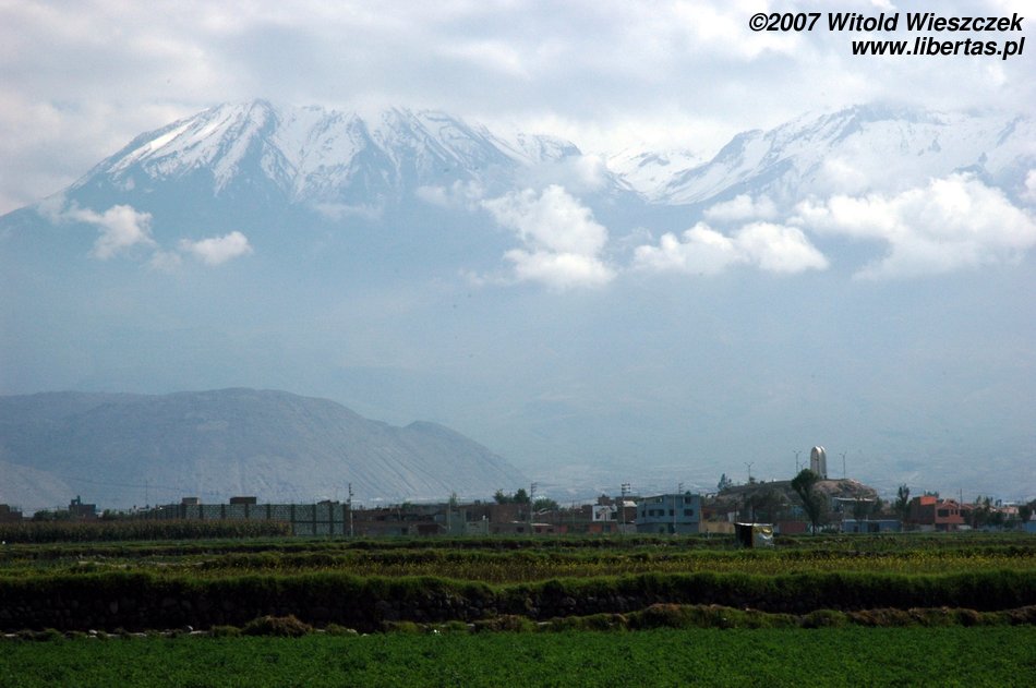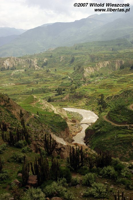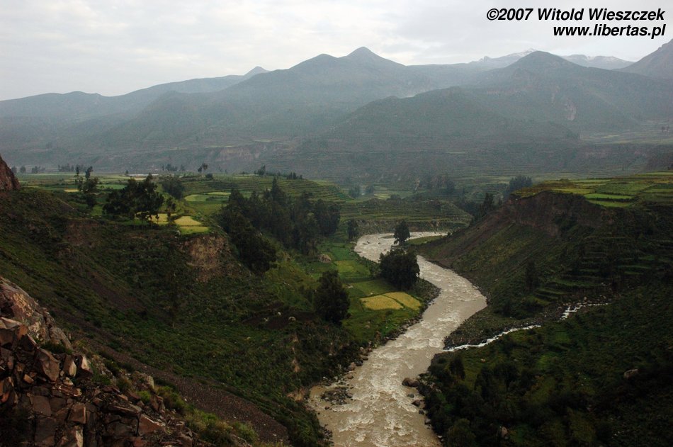 Dolina rzeki Colca leży ponad 100 km od Arequipy. Jej granice wyznaczają otaczające ją szczyty wulkaniczne Mismi (5597 m), Cutiti (5063 m), Bomboya (5200 m), Hualca Hualca (6025 m), Sabancaya (5976 m), Ampato (6310 m) i Ananta (5100 m). Na dnie doliny (ok. 3200 m) leży 8000 hektarów malowniczych preinkaskich tarasów uprawnych wraz z wyrafinowanym systemem nawadniającym. Wykorzystany jest każdy kawałek żyznej gleby, na łagodnych stokach widzimy tarasy szerokie, na stromych krawędziach wąskie.