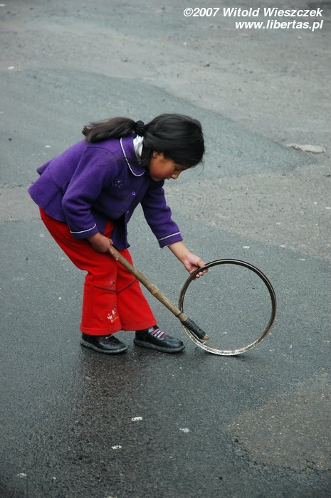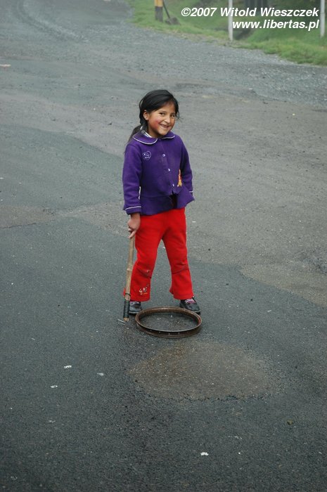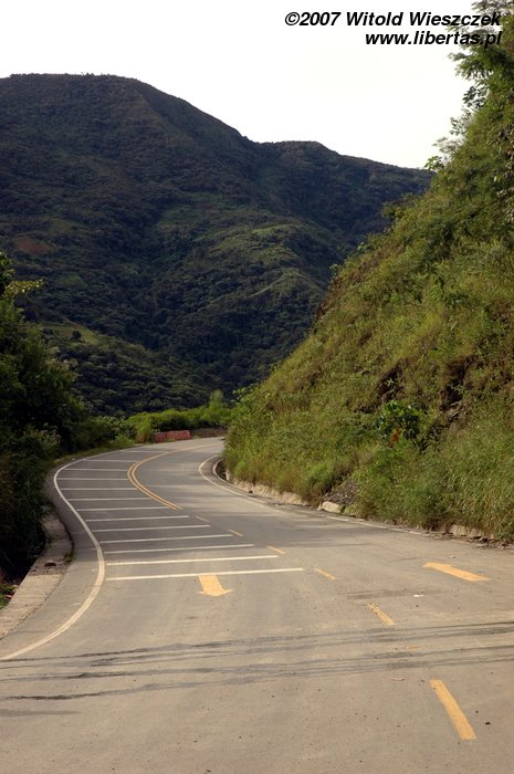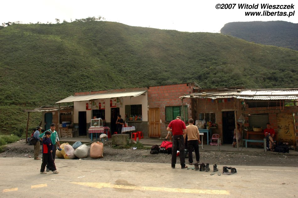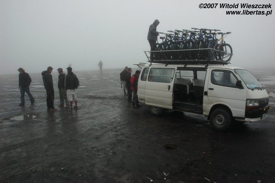 Na wypadek gdybym skończył w przepaści, aparat zostawiłem w samochodzie, a zdjęcia robiłem tylko w trakcie postojów. Zjazd ma podobno długość około 70 km i kończy się na wysokości 1200 m n.p.m., jesteśmy więc 3525 metrów niżej niż rano! Cali jesteśmy ubłoceni, bo w rowerach nie ma błotników, pewnie po to, by turysta miał więcej wrażeń. Śpieszymy się na autobus, więc tylko szybko myję twarz, żeby nie straszyć ludzi. Po drodze w samochodzie jemy na obiad kurczaka z bananami, całkiem dobre.