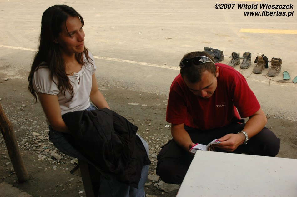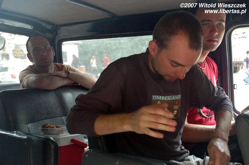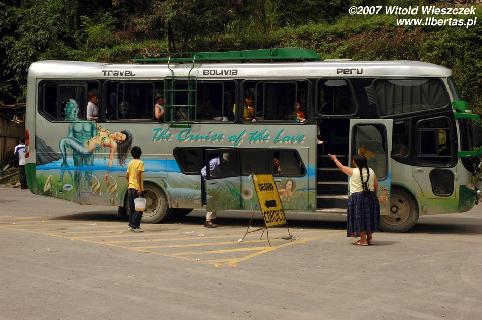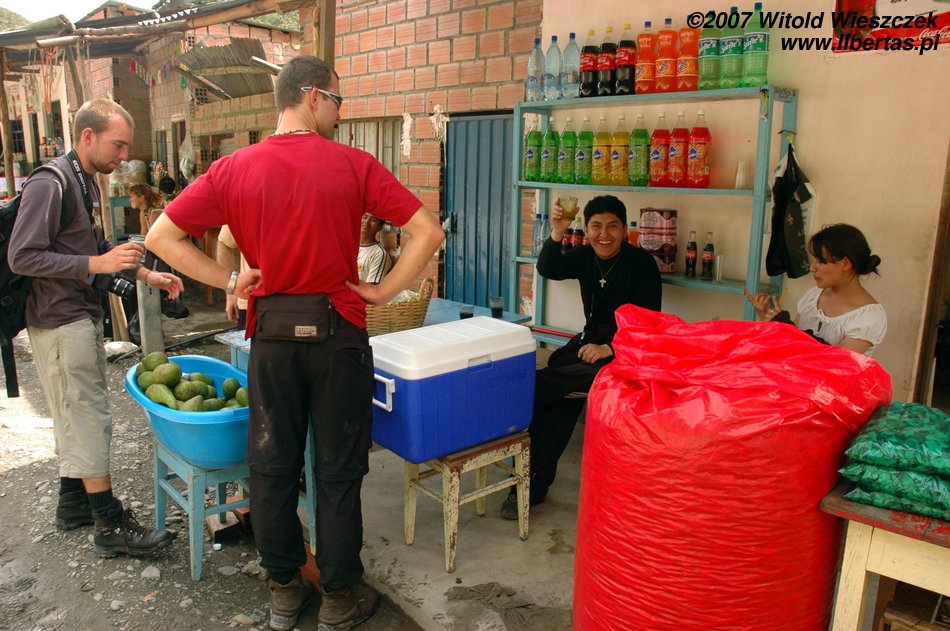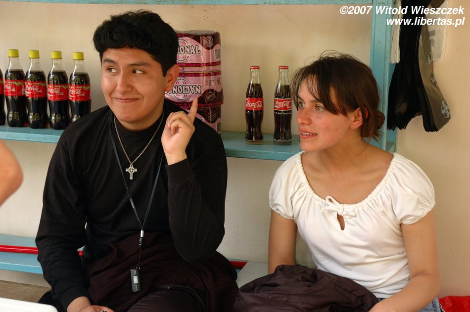 Kierowca jedzie na złamanie karku, a gdy docieramy na miejsce i tak wygląda na to, że się spóźniliśmy. Ale nie, to autobus się spóźnia. Żeby zabić czas, otwieramy Pisco de Coca. Nasza czwórka plus Carol i Mauricio, to w sumie sześć osób, no a powiedzcie sami, co to jest pół litra na sześciu? Nic! Ale w Ameryce jest chyba inny klimat, więc my jesteśmy trzeźwi jak świnie, czego nie można powiedzieć o naszych boliwijskich przyjaciołach. Ma to swoje dobre strony, po każdej wypitej szklaneczce Mauricio lepiej mówi po angielsku! Jest naprawdę bardzo sympatycznie!