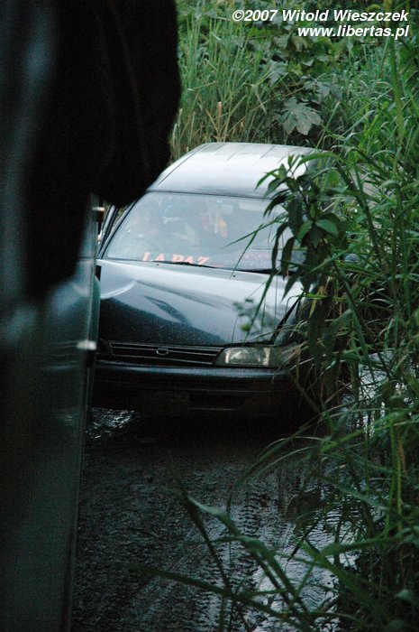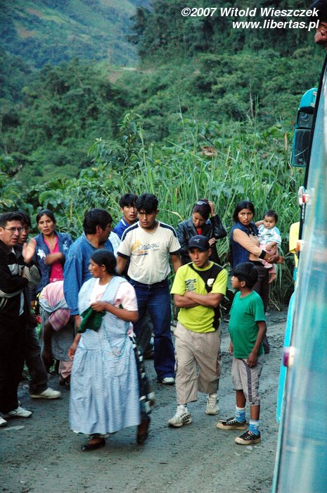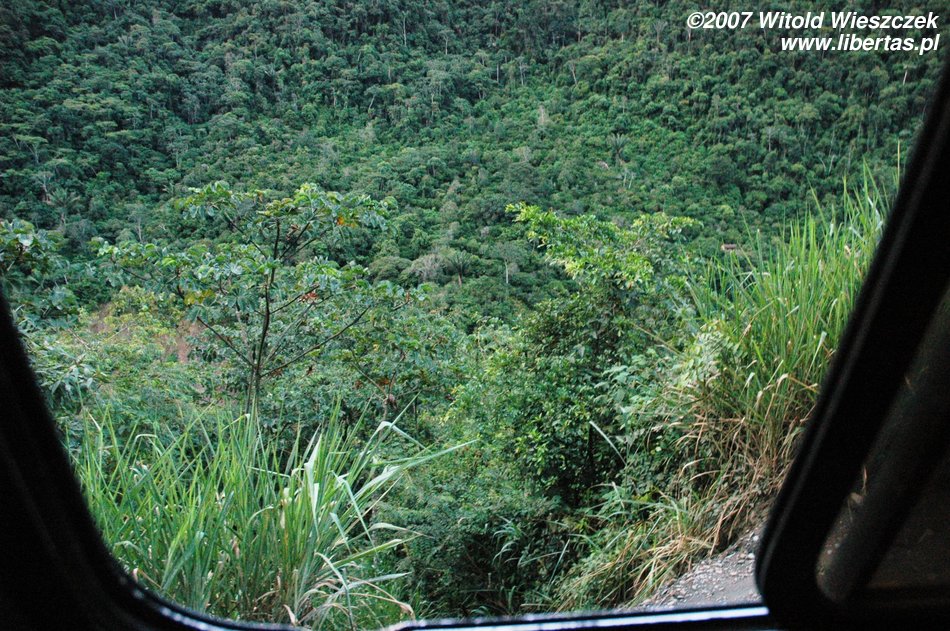 Po drodze mamy dwie przerwy (nie, kierowca się nie zlitował!), pierwsza po jakiejś godzinie, może dwóch, na skutek czołowego zderzenia z Toyotą. Jak na Drogę Śmierci to nic takiego. Po kolejnej godzinie jazdy stajemy, żeby pomóc w wyciąganiu człowieka, który z nie do końca wiadomych nam przyczyn znalazł się na dole urwiska. Ale szczerze mówiąc mam gdzieś, że ta droga jest niebezpieczna, najbardziej we znaki daje się to, że jest po prostu cholernie męcząca! Nie ma bata! Z powrotem lecimy samolotem!