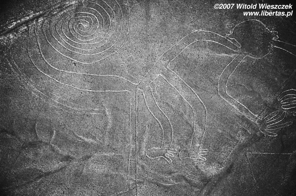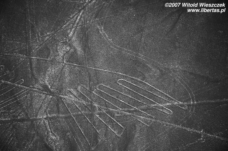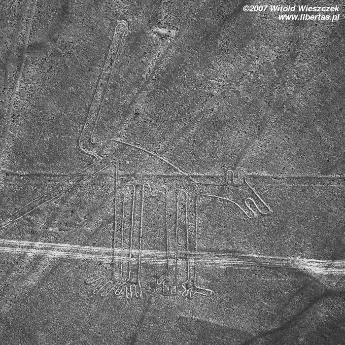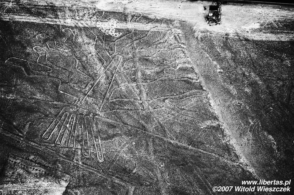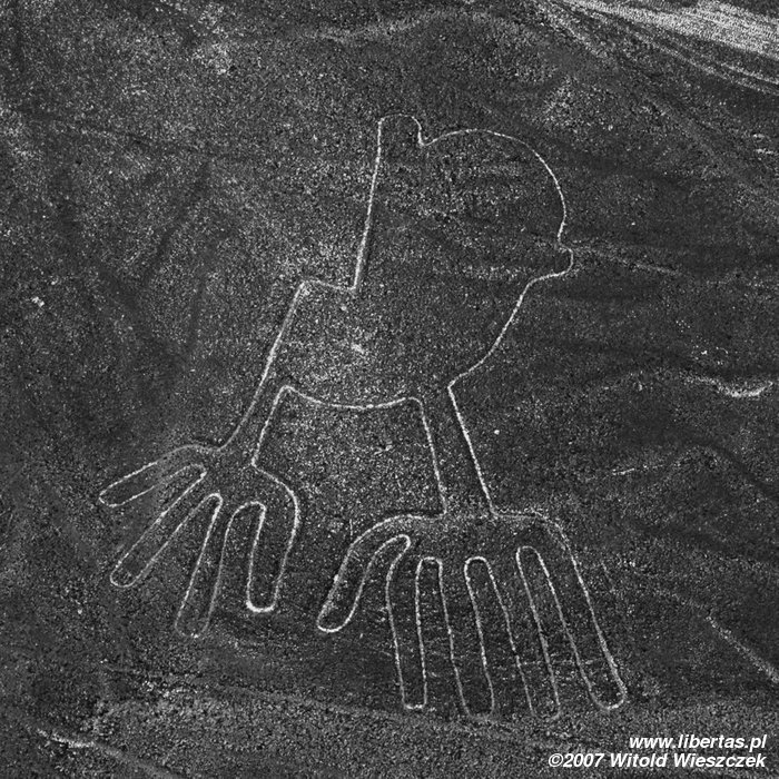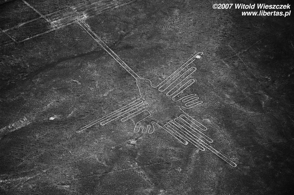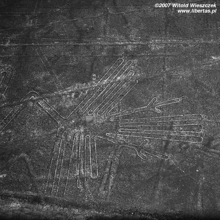 Nazca to małe, liczące około 20 tyś. mieszkańców peruwiańskie miasteczko leżące na płaskowyżu o tej samej nazwie, na wysokości 588 m n.p.m. Międzynarodową sławę przyniosły mu tajemnicze linie odkryte przypadkowo w latach dwudziestych ubiegłego wieku, kiedy to nad tym obszarem zaczęły latać samoloty. Na temat powstania rysunków powstało wiele różnych teorii, np Erich von Daeniken twierdzi, że są to pasy startowe zbudowane przez Indian dla jakiejś obcej cywilizacji. Ale niektórzy wysilili się trochę bardziej, w końcu wszystko, czego nie rozumiemy, można przypisać kosmitom, ale to chyba nie o to chodzi...