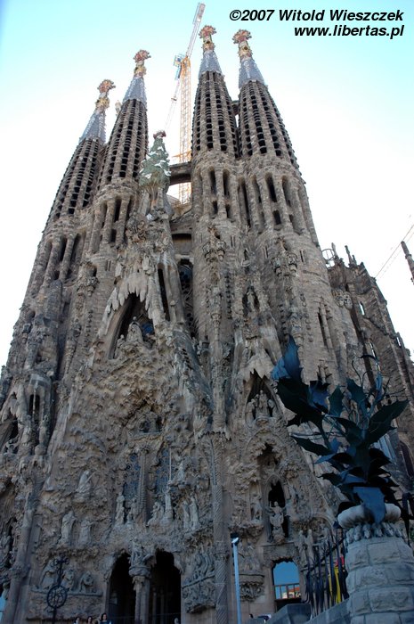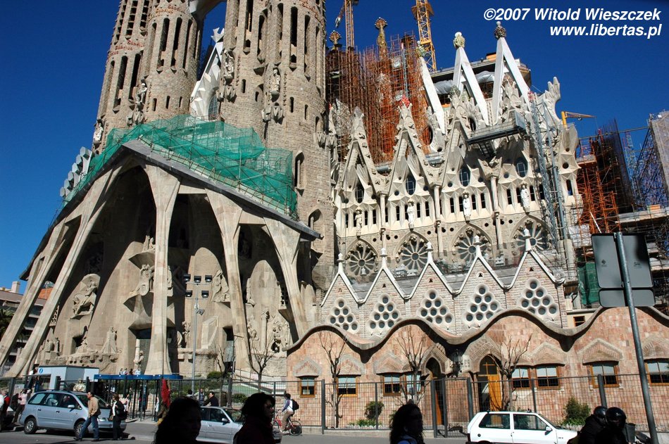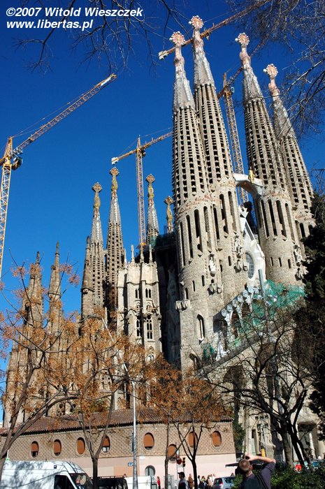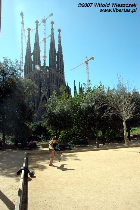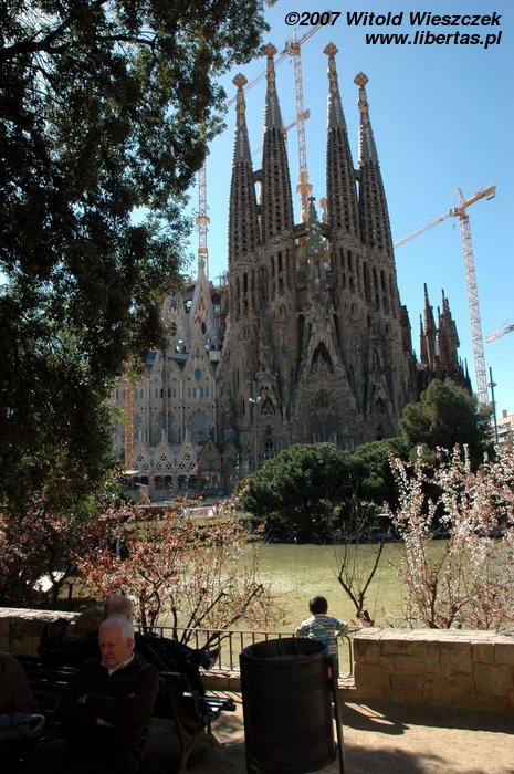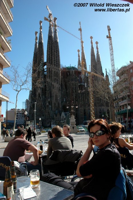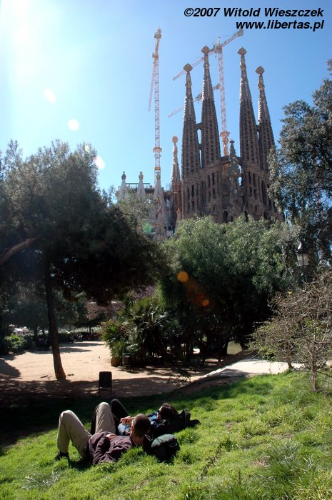 Pozwoliliśmy sobie na chwilę relaksu w tych pięknych okolicznościach... bazyliki, której pełna nazwa po katalońsku brzmi: Temple Expiatori de la Sagrada Família. Budowę kościoła rozpoczęto w 1884 roku, więc jak łatwo policzyć prace trwają już ponad 100 lat! Nic dziwnego, zgodnie z zamysłem Antoniego Gaudíego konstrukcja budowli ma przypominać jeden, wielki organizm, a żaden detal nie może się powtarzać! Ta niepowtarzalność musi kosztować dużo czasu, nawet bardzo dużo!