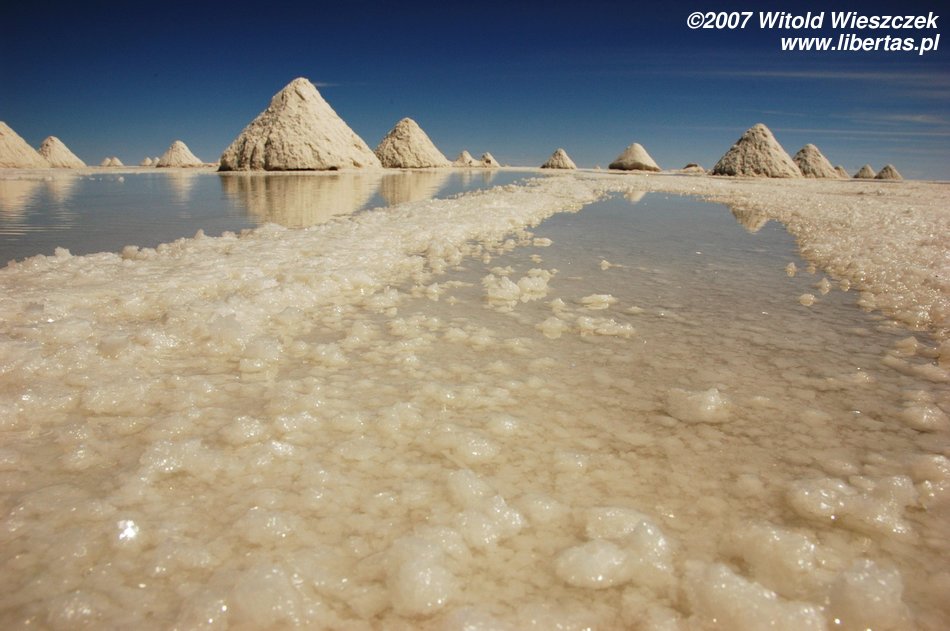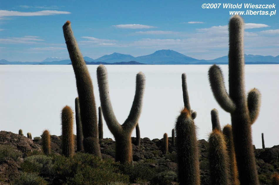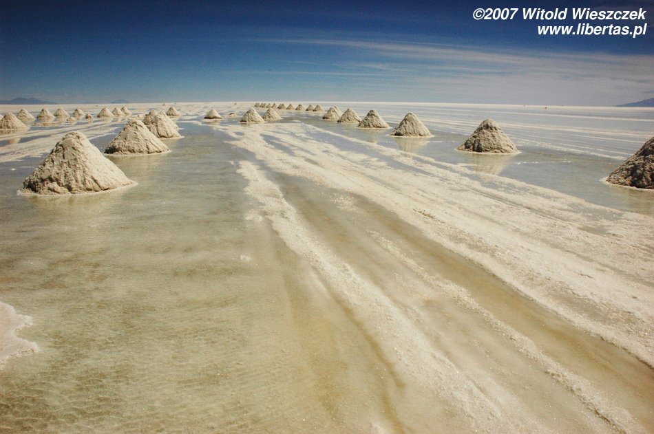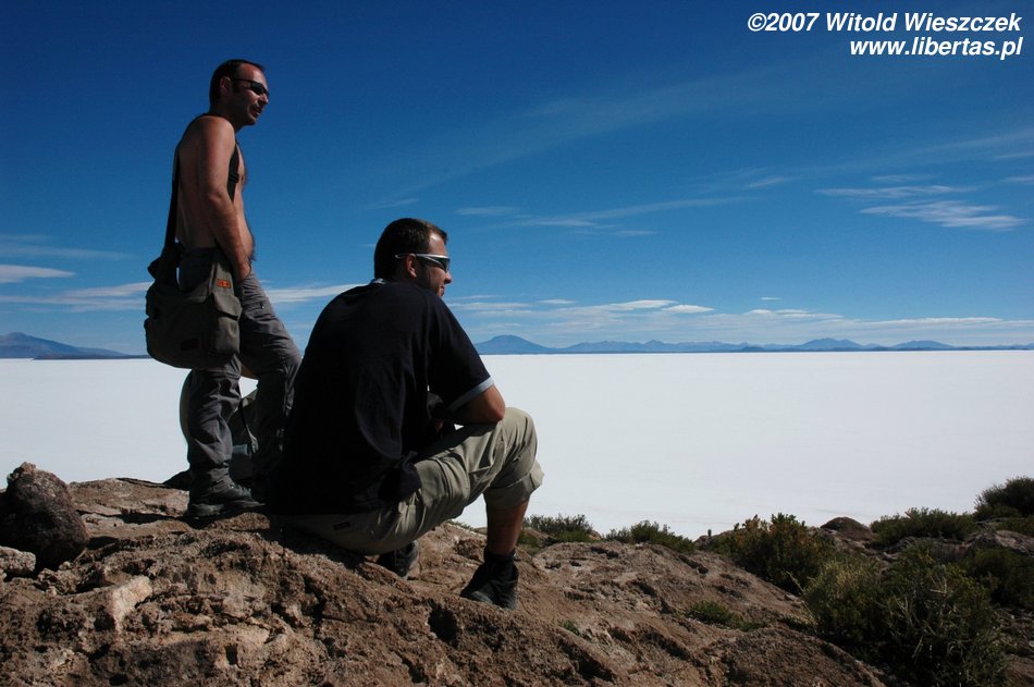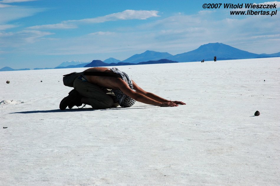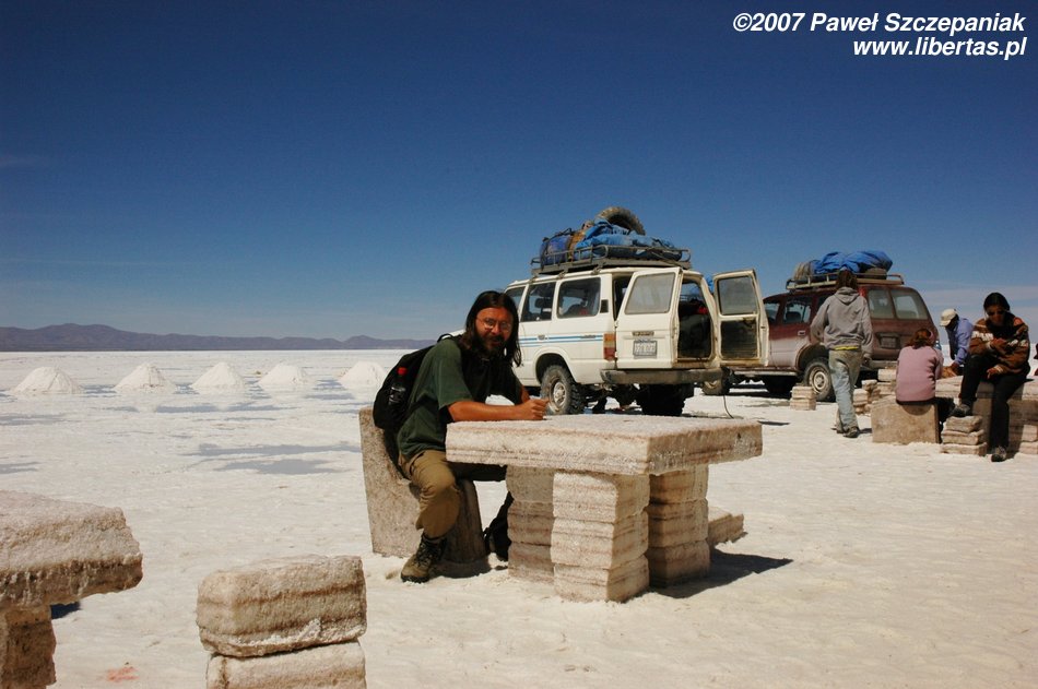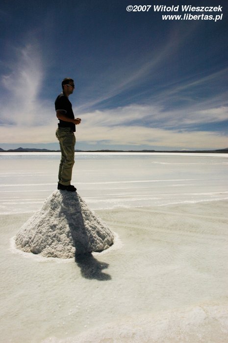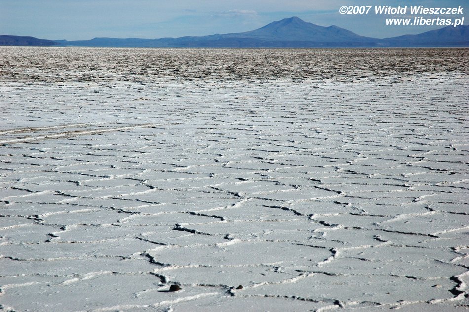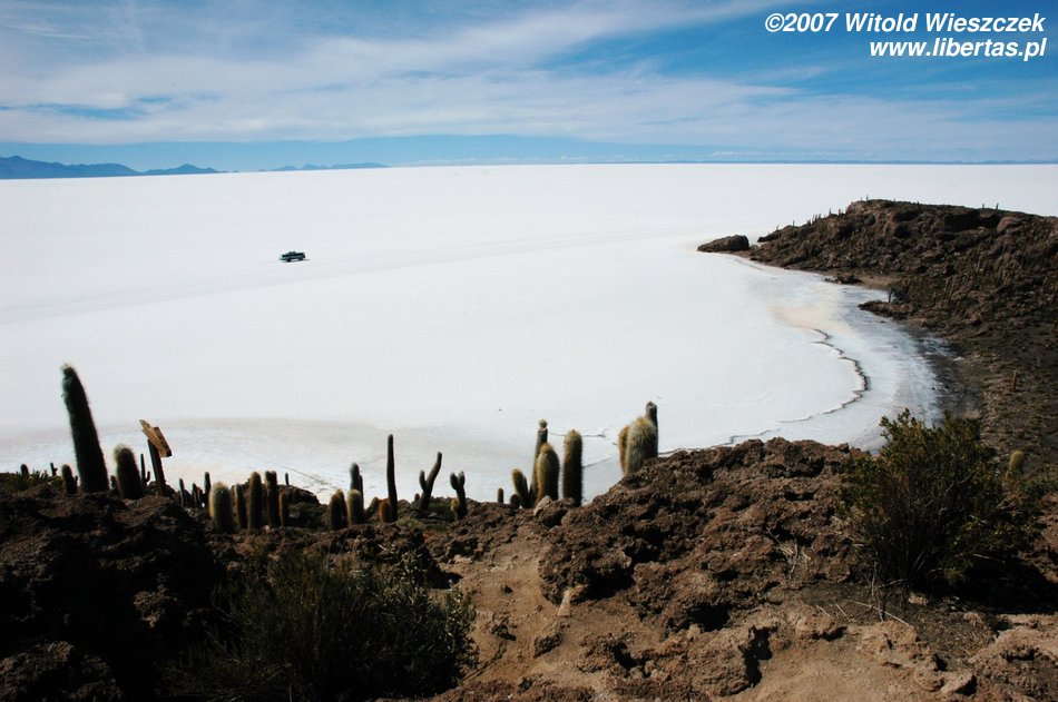 Niedługo potem wjechaliśmy na Salar de Uyuni (Boliwia), czyli największą solniczkę świata – zajmuje powierzchnię 10,582 km² i zawiera około 10 billionów ton soli! Leży na Altiplano na wysokości 3653 m n.p.m. i podobnie jak Titicaca (64 zdjęcia) jest pozostałością po istniejącym w plejstocenie jeziorze Ballivian. Jest to jeden z najbardziej płaskich obszarów na świecie – różnica wzniesień to niecałe 41 cm!