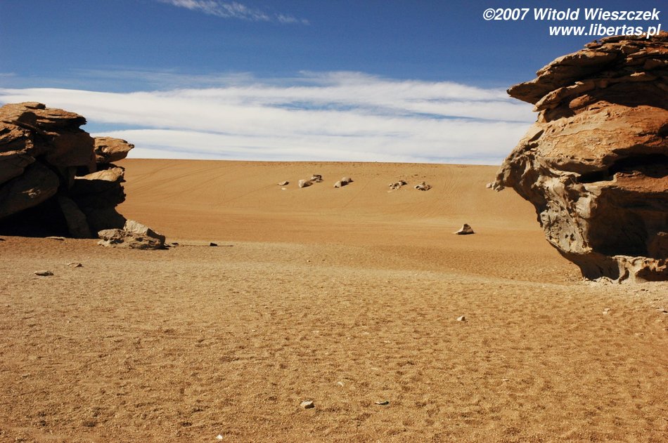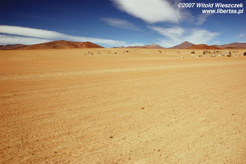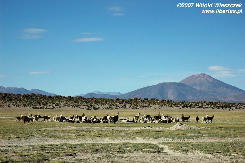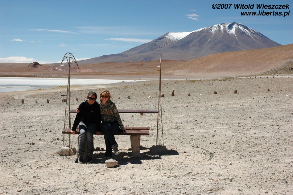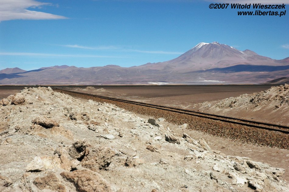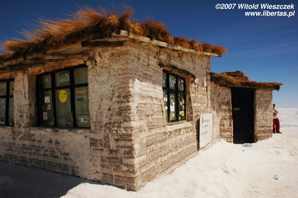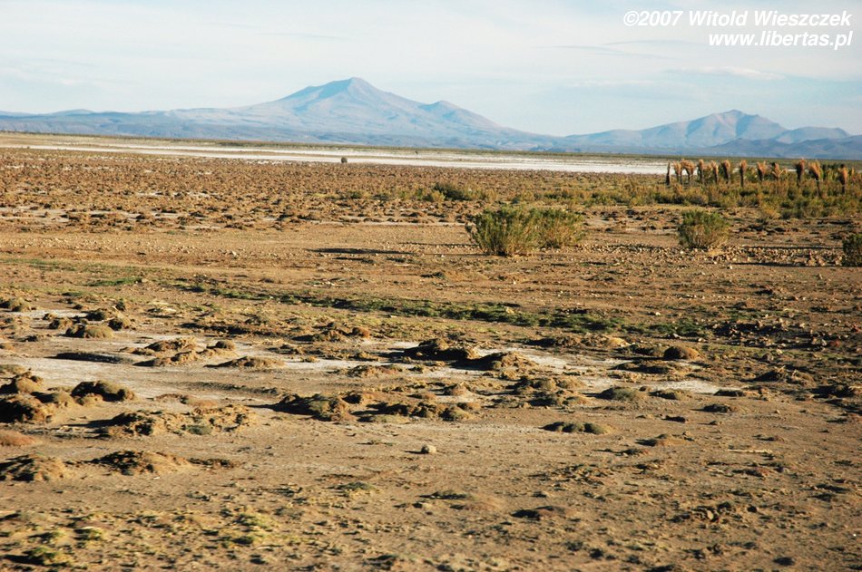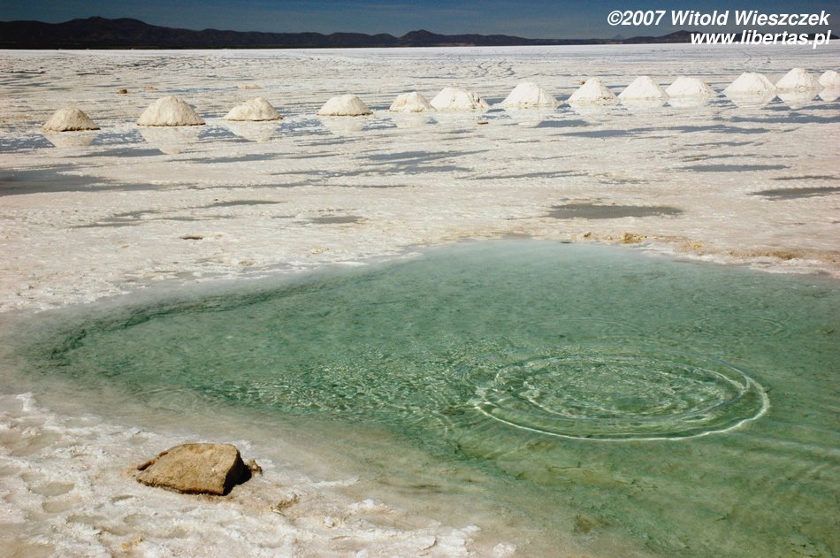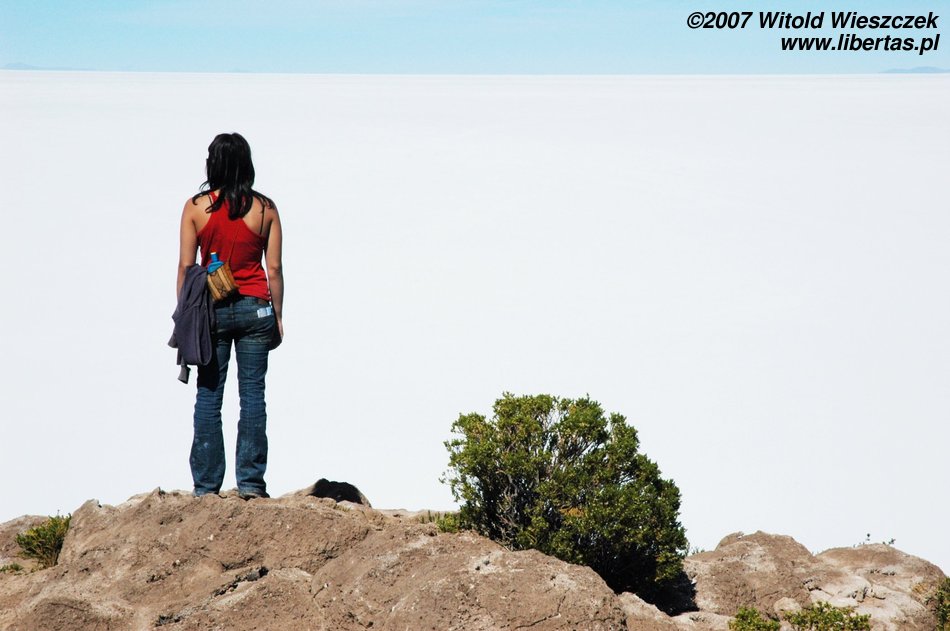 Niedługo potem wjechaliśmy na Salar de Uyuni (Boliwia), czyli największą solniczkę świata – zajmuje powierzchnię 10,582 km² i zawiera około 10 billionów ton soli! Leży na Altiplano na wysokości 3653 m n.p.m. i podobnie jak Titicaca (64 zdjęcia) jest pozostałością po istniejącym w plejstocenie jeziorze Ballivian. Jest to jeden z najbardziej płaskich obszarów na świecie – różnica wzniesień to niecałe 41 cm!
