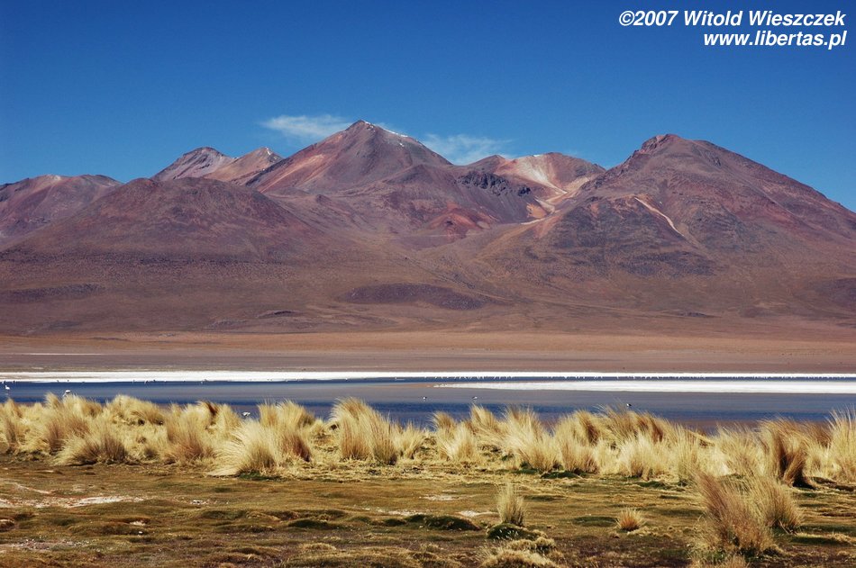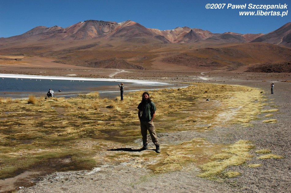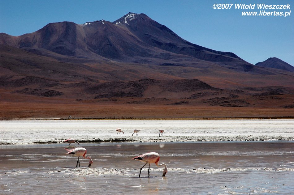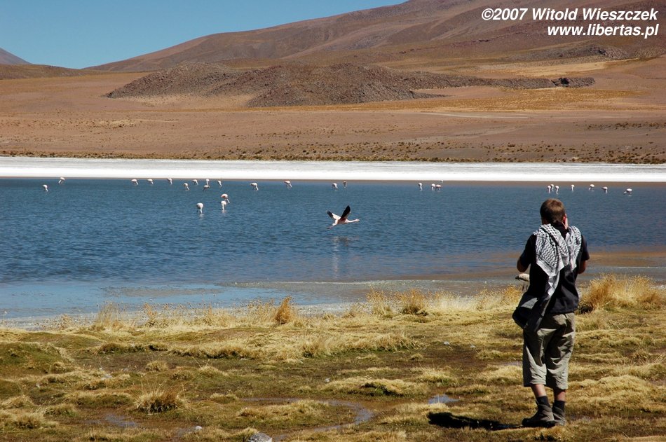 Jedziemy dalej i docieramy do bajecznie wyglądającego niesamowicie niebieskiego jeziora, po którym przechadzają się majestatycznie flamingi.