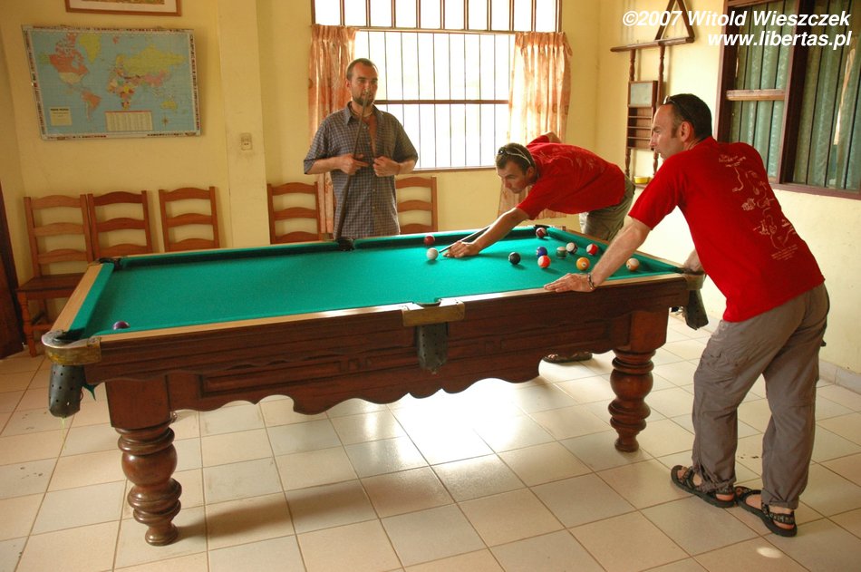 Wracamy do hotelu i przed spaniem rozgrywamy jeszcze dwie albo trzy partyjki bilarda. Ja ze Szczepanem kontra Robak i Doktor. Pomimo że nie gram za często i daleko mi do jakiegoś przyzwoitego poziomu (prawie wszystkie bile wbija Szczepan), to ja zostaję mistrzem ostatniej bili! Uderzam białą, która leci przez dokładnie cały stół, pod bardzo ostrym kątem odbija się od bandy i popycha czarną (znowu przez cały stół) do uzy. Oczywiście to czysty fuks, ale i tak duma mnie rozpiera, zwłaszcza że całkiem zaskakująco wygrywamy wszystkie partie! Ale będzie się dobrze spać. Buenas Noches