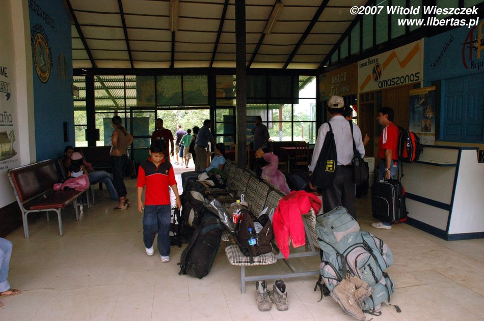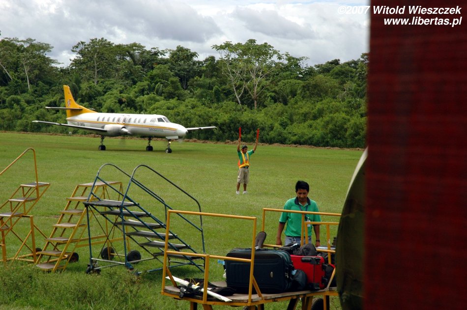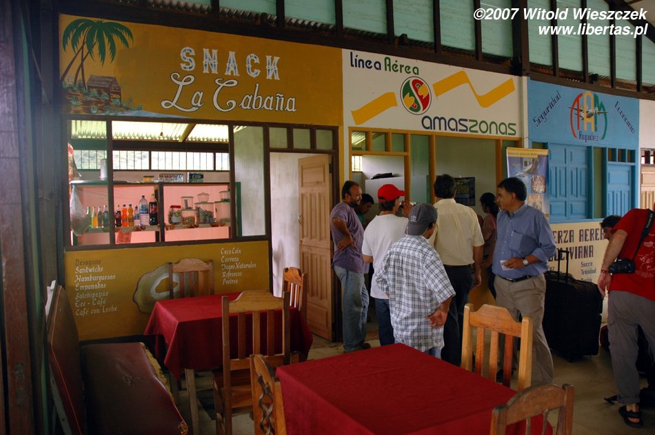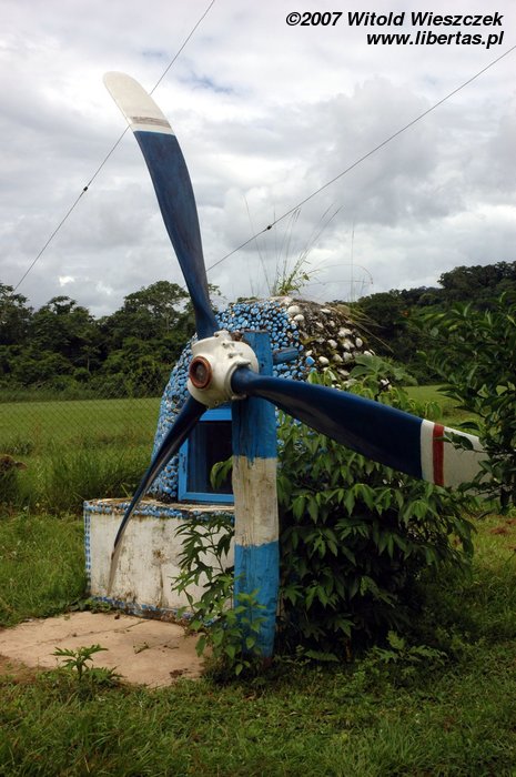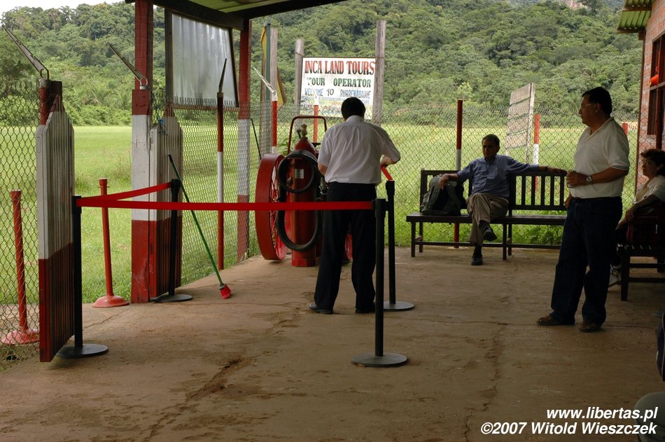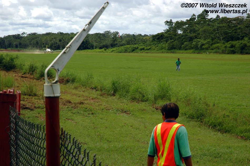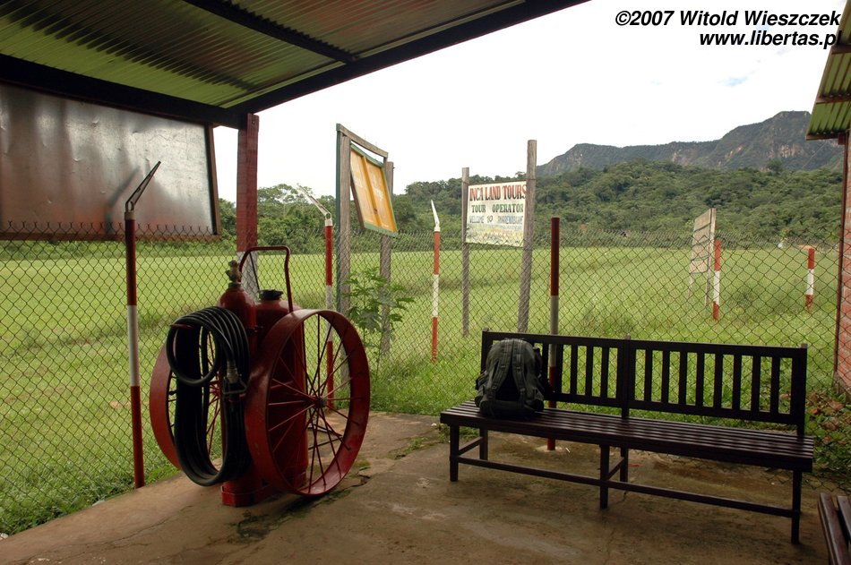Na lotnisku podziwiam znowu lokalny koloryt, od osobliwego wyposażenia przeciwpożarowego, po oprawę artystyczną przy odprawie pasażerów. Komicznie wyglądał pan z obsługi lotniska, gdy z pełną pompą kazał nam się odsunąć, a następnie zagrodził przejście czerwoną taśmą, co widać na zdjęciu. Lotnisko małe, pasażerów 19, ale widać duże ambicje, w każdym razie procedury jak z portu międzynarodowego.