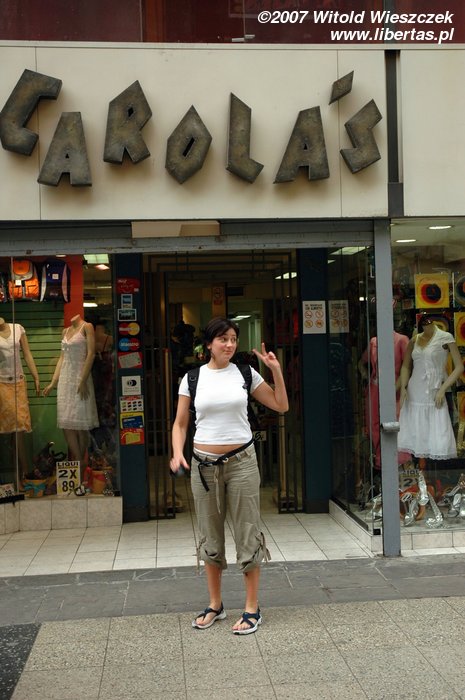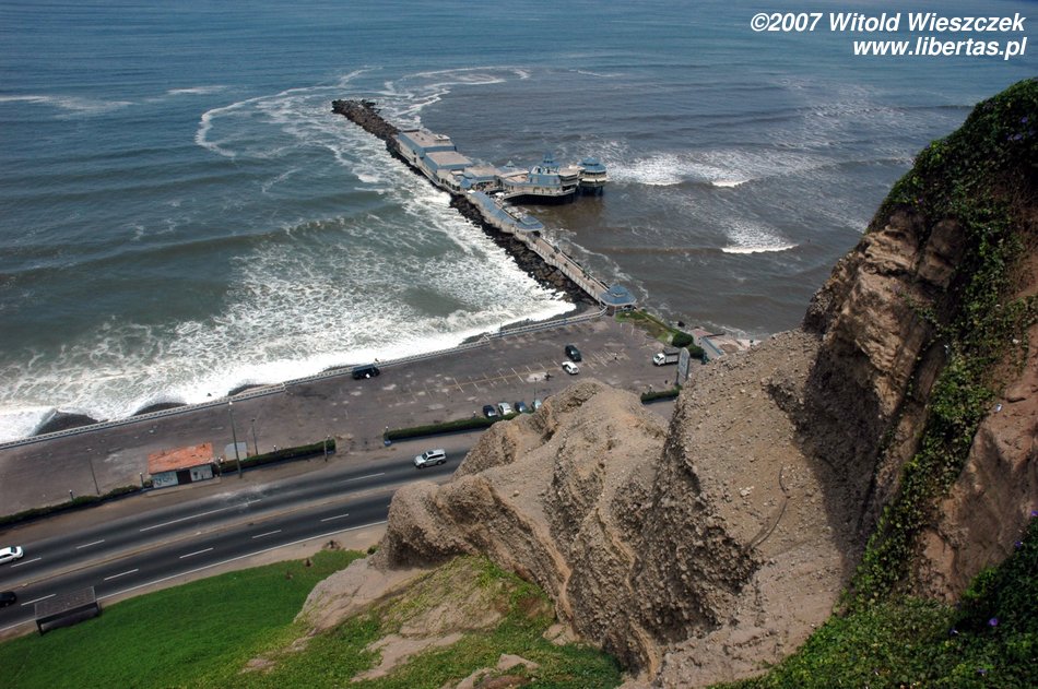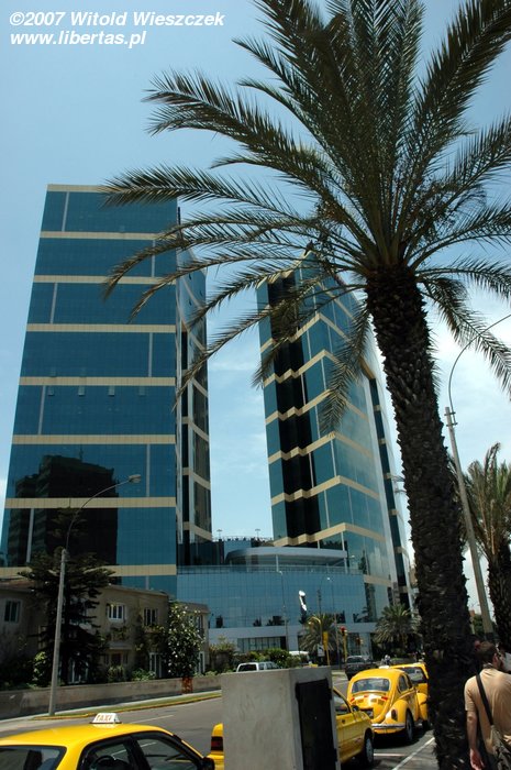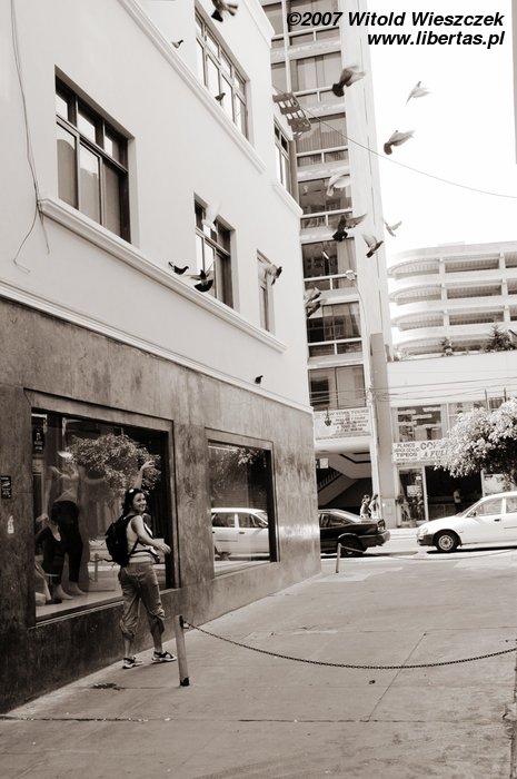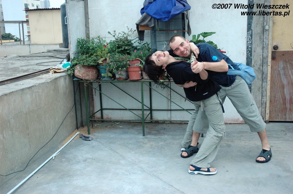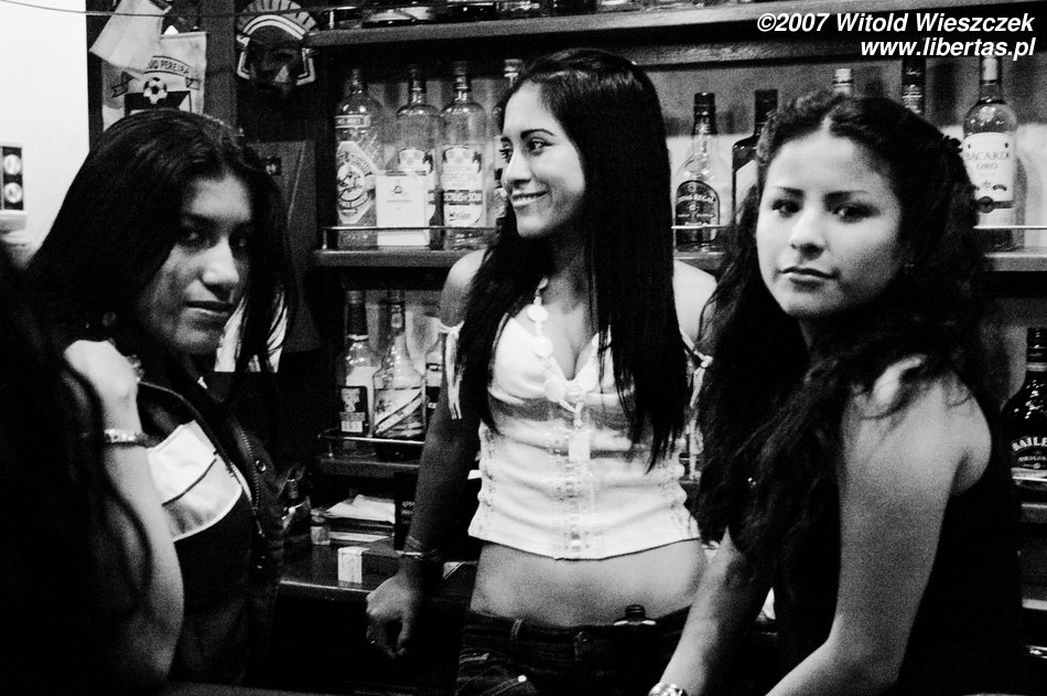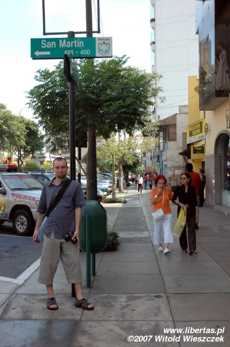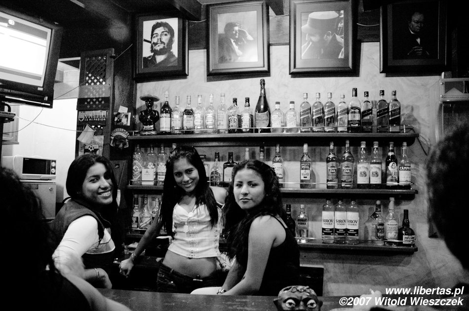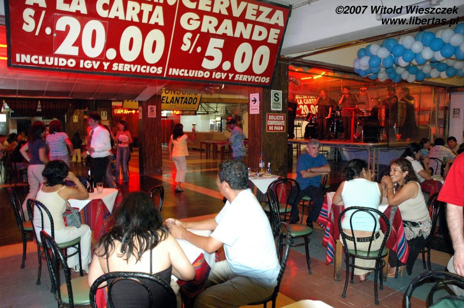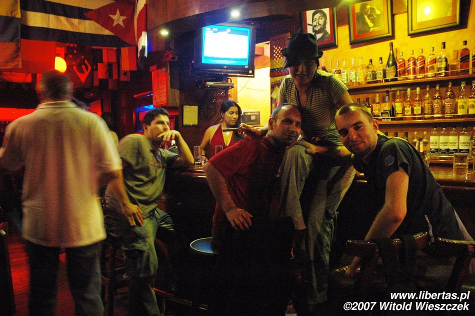 Taksówka z lotniska zabrała nas do hotelu w dzielnicy Miraflores, kosztowała 40 Soli (1 Nowy Sol to równowartość mniej więcej złotówki)! Oczywiście przepłaciliśmy, ale to były nasze pierwsze minuty w nowym kraju... Przez okno samochodu podziwiałem Limę, wszystko było dla mnie takie inne, takie nowe... W hotelu nie zabawiliśmy długo i zaraz ruszyliśmy na miasto... Miraflores okazała się być bardzo bezpieczną dzielnicą, wszędzie pełno ochrony i nawet nocą można było bez obaw wypuścić się na spacer... Więc spacerowaliśmy, jedna knajpa, druga... I już nawet wracaliśmy do hotelu (było koło godziny trzeciej) kiedy nagle usłyszałem przyjemne taneczne dźwięki kubańskiej muzyki... Wiedziałem, że trzeba tam iść, Karolina od razu poparła propozycję i reszta nie miała dużego wyboru.