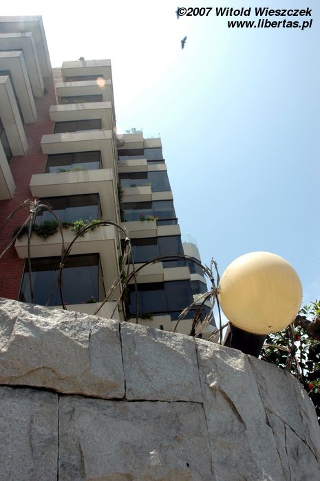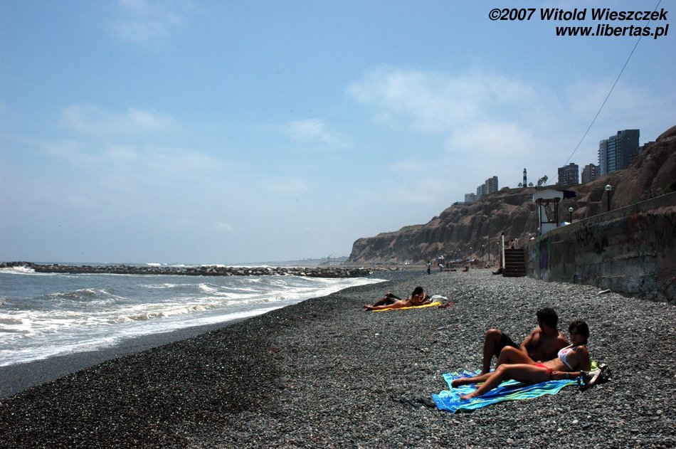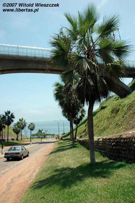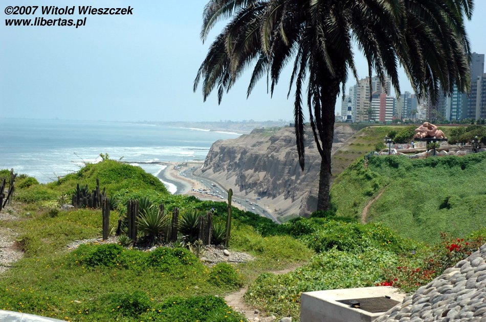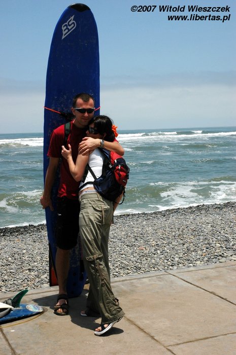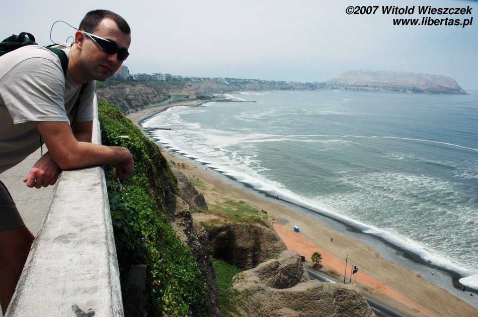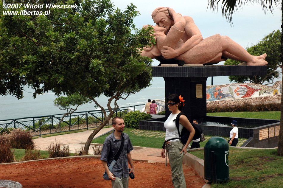 Przed wyjazdem wybieramy się na miasto na zakupy, chcemy kupić między innym kartusze, których nie mogliśmy ze sobą wziąć na pokład samolotu. Po drodze odwiedzamy Park Miłości (El Parque del Amor) i idziemy przywitać się z Pacyfikiem, zanurzyć na chwilę stopy w oceanie... Miraflores to dzielnica w dużej mierze opanowana przez turystów. Ciekawe co czują inni, przechodząc koło budynków otoczonych drutem kolczastym, albo drutem pod napięciem!