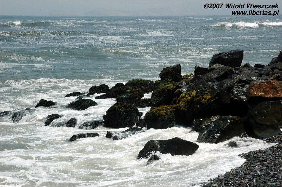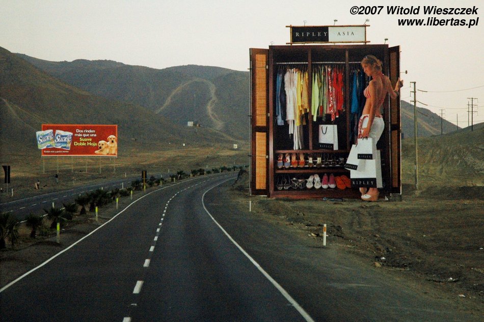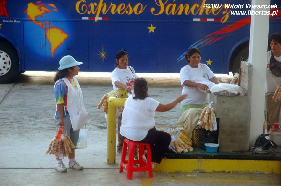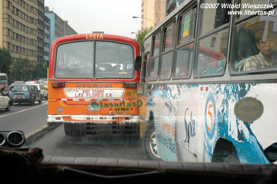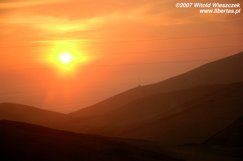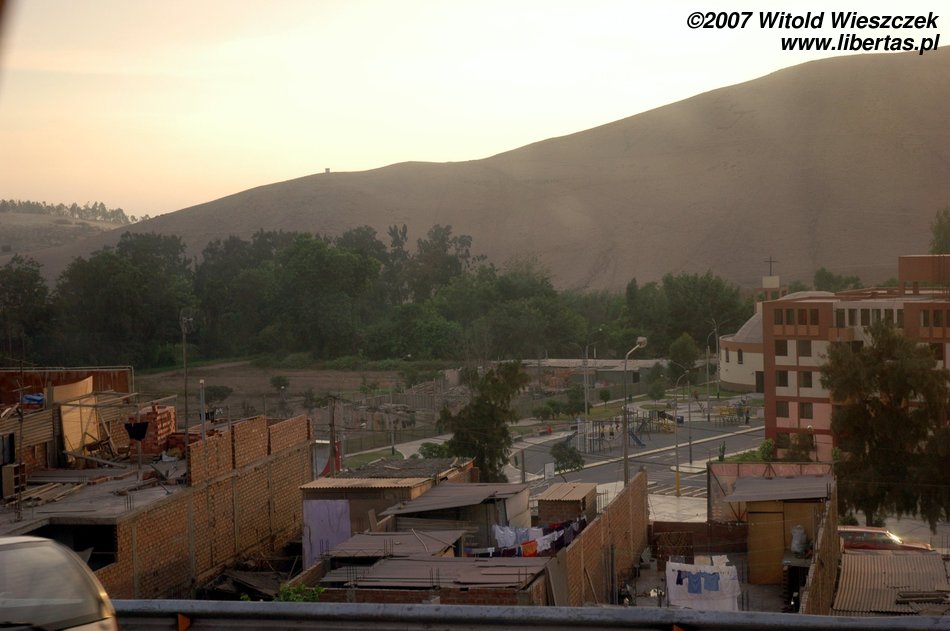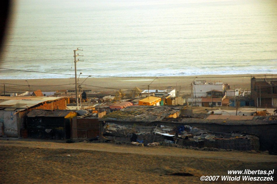 Wracamy do hotelu po plecaki i jedziemy na terminal autobusowy, bilet do Ica kosztuje 26 soli, dla studentów, czyli dla nas tylko 23 sole. W autobusie po drodze można oglądać film, ale mnie bardziej interesuje to, co za oknem, właśnie zachodzi słońce, krajobraz jak z Marsa... Lima liczy sobie 8 mln mieszkańców, jak widać część tych ludzi mieszka w slumsach na obrzeżach miasta. Dziwnie kontrastuje piękno oceanu i niedokończone „domy” w opłakanym stanie...