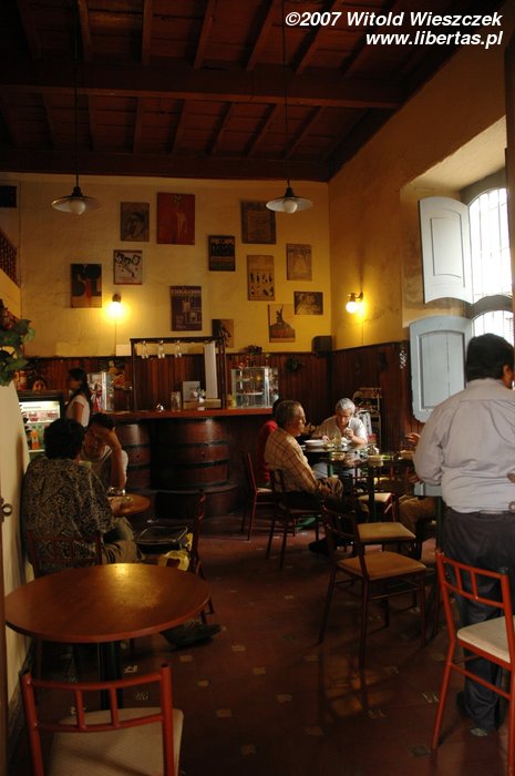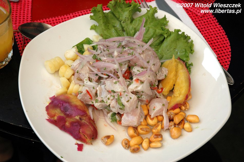 Przez przypadek trafiliśmy do rewelacyjnej knajpki, w której jedliśmy surową rybę! Możecie wierzyć albo nie, ale była rewelacyjna! A do tego wszystkiego bardzo sympatyczna obsługa, my też chyba byliśmy sympatyczni, bo dostaliśmy darmową kolejkę pisco (ichniejsza wódka). Zresztą wszędzie, gdzie mówiliśmy, że jesteśmy Polakami (sommos Polacos) byliśmy bardzo mile witani. Za pięć porcji ryby, mate de coca i kolę, a także pyszny sok nie pamiętam z czego, zapłaciliśmy w sumie jedynie 137 soli. W każdym razie, jeśli będziecie na Miraflores, to gorąco polecam: CORTEZ, Jr. San Martin 465. Gorące pozdrowienia dla pani ze zdjęcia.