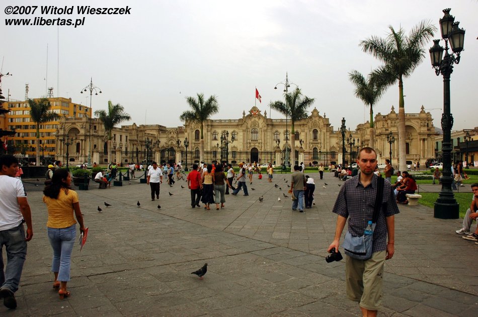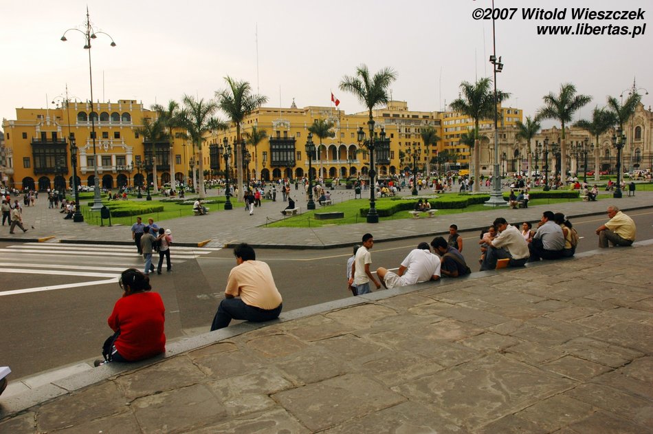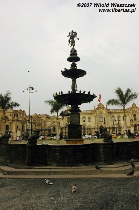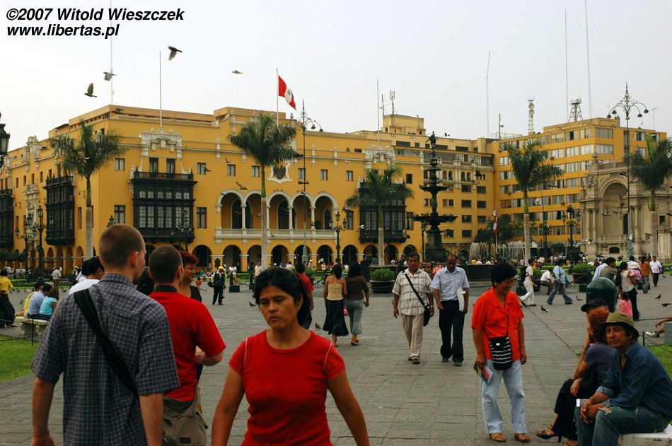 Docieramy do głównego placu, który naprawdę robi wrażenie... Znajdują się tutaj najważniejsze budynki, między innymi Pałac Wicekrólów (Palacio de Gobierno), Pałac Arcybiskupi (Palacio Arzobispal) i kilkakrotnie zniszczona przez trzęsienia ziemi katedra. Najstarszym zabytkiem na placu jest fontanna z brązu, wzniesiona w roku 1650. Jest piękna pogoda, więc na placu jest mnóstwo ludzi, całe rodziny z dziećmi przesiadają na ławkach lub spacerują.