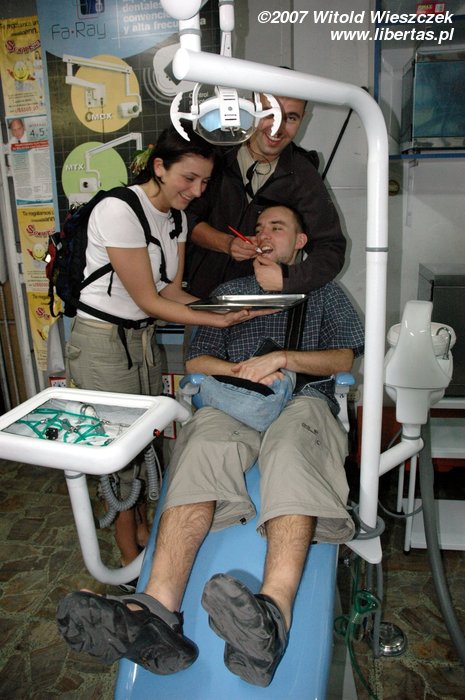 Oczywiście towarzysząca mi banda dentystów nawet w Limie znalazła miejsce dla uprawiania swojego niecnego i sadystycznego procederu... Na szczęście nie było chętnych, więc poszliśmy potańczyć i przy okazji coś zjeść. Jeśli dobrze zrozumiałem to, co mówiła Maritza, to po zmroku policja w Limie nie pracuje, a w związku z tym robi się wtedy niebezpiecznie i lepiej nie włóczyć się tak jak w dzień, szybko wsiadamy więc do taksówki szybko i wracamy do Miraflores... Kierunek Cubata.